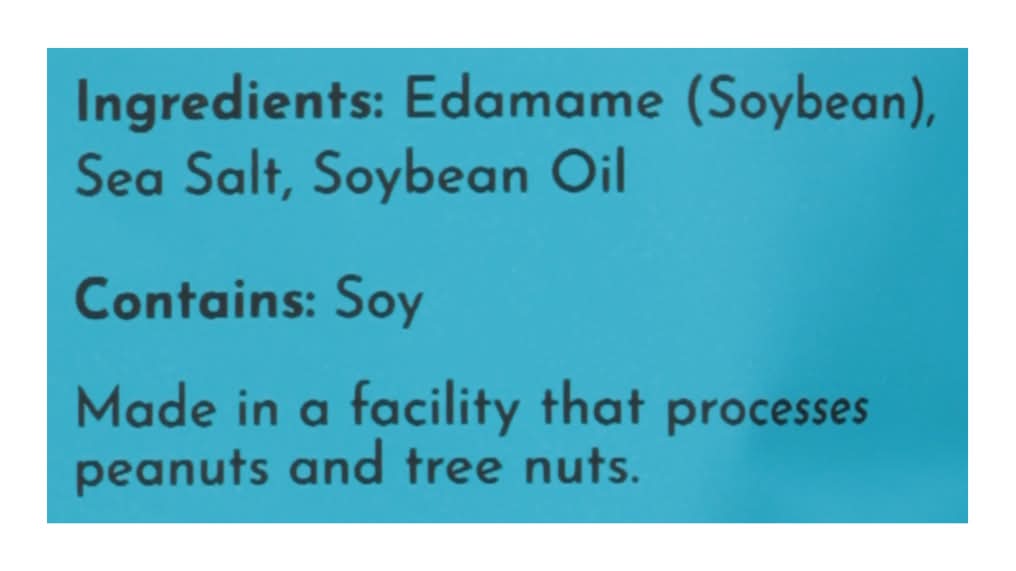 Ingredients: Edamame (Soybean), Sea Salt, Soybean Oil Contains: Soybeans, Peanuts, Tree Nuts