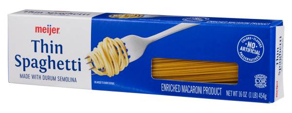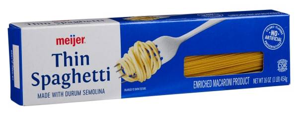 Its never been so easy to satisfy every tastebud at the dinner table. Meijer Thin Spaghetti Pasta makes for a quick, versatile dinner the entire family will love! Bring the authentic flavors of Italian food to your kitchen by simply cooking the pasta in boiling water before mixing it with your favorite sauces and cheeses. Complete this delicious, dreamy dinner with a side of garlic bread.