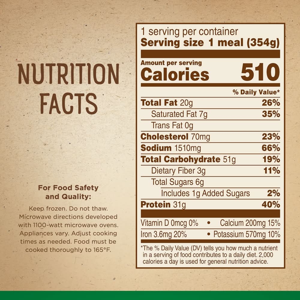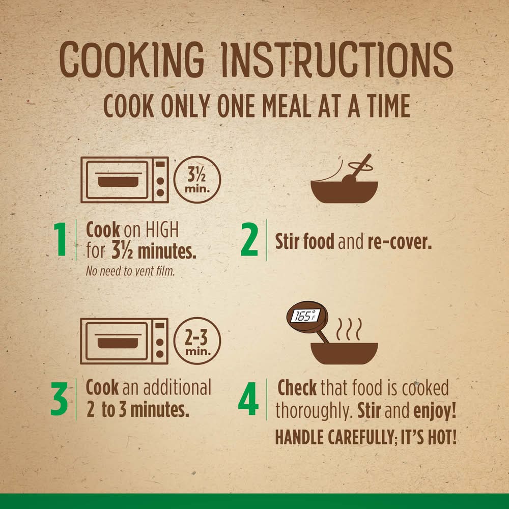 Directions for use: Must be cooked thoroughly. Microwave Oven: Cook only one at a time. Cook on high 3-1/2 minutes. No need to vent film. Gently stir and re-cover. Cook an additional 2 to 3 minutes. Check that food is cooked thoroughly to 165 degrees F. Handle carefully; it's hot! Enjoy! Conventional Oven: Do not prepare in toaster oven. Preheat oven to 375 degrees F. Cook on baking sheet in center of oven 50 to 55 minutes. Check that food is cooked thoroughly to 165 degrees F. Handle carefully; It's hot! Let stand 2 minutes. Enjoy! Food Safety and Quality. Keep frozen. Do not thaw. Microwave directions developed with 1100-watt microwave ovens. Appliances vary. Adjust cooking times as needed. Food must be cooked thoroughly to 165 degrees F. Keep frozen. Storage recommendation: Keep frozen.