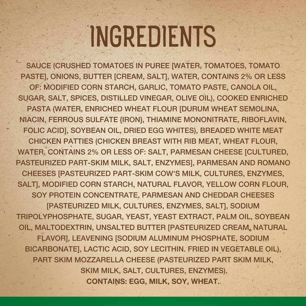 Ingredients: Sauce Crushed Tomatoes in Puree [Water, Tomatoes, Tomato Paste], Onions, Butter [Cream, Salt], Water, Contains 2% or Less of: Modified Corn Starch, Garlic, Tomato Paste, Canola Oil, Sugar, Salt, Spices, Distilled Vinegar, Olive Oil, Cooked Enriched Pasta Water, Enriched Wheat Flour [Durum Wheat Semolina, Niacin, Ferrous Sulfate {Iron}, Thiamine Mononitrate, Riboflavin, Folic Acid], Soybean Oil, Dried Egg Whites, Breaded White Meat Chicken Patties Chicken Breast with Rib Meat, Wheat Flour, Water, Contains 2% or Less of: Salt, Parmesan Cheese [Cultured, Pasteurized Part-Skim Milk, Salt Enzymes], Parmesan and Romano Cheeses [Pasteurized Part-Skim Cow's Milk, Cultures, Enzymes, Salt], Modified Corn Starch, Natural Flavor, Yellow Corn Flour, Soy Protein Concentrate, Parmesan and Cheddar Cheeses [Pasteurized Milk, Cultures, Enzymes, Salt], Sodium Tripolyphosphate, Sugar, Yeast, Yeast Extract, Palm Oil, Soybean Oil, Maltodextrin, Unsalted Butter [Pasteurized Cream, Natural Flavor], Leavening [Sodium Aluminum Phosphate, Sodium Bicarbonate], Lactic Acid, Soy Lecithin, Fried in Vegetable Oil, Part Skim Mozzarella Cheese Pasteurized Part Skim Milk, Skim Milk, Salt, Cultures, Enzymes. Contains: Egg, Milk, Mustard (Canada and EU), Soy, Wheat