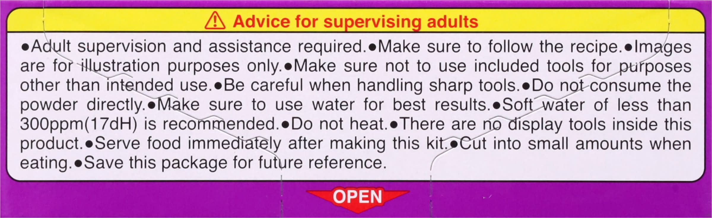 Usage of instructions:recipe: ramune soda, strawberry, cola & mango flavors. wash your hands well. prepare a glass of water. cut apart tray as shown in pictures. fold the gyoza mold along the red line. 1. make mango pudding! add water to the cup until it is half full. add powder from the orange packet. mix. it will become firm in 10 minutes. 2. make ramen toppings (boiled egg & naruto). pour water up to line in the star tray. add powder from the blue packet. mix until thick. tear off 2 pieces of the dough and fill the naruto/egg molds. remove. 3. make gyoza dumpling! divide remaining dough in quarter. spread one dough evenly to match shape and size of the packing pouch guide. place the dough on the gyoza mold and press to make the hollow space. fill space on each side with powder from the red packet. close the mold and press sides together to attach. repeat once more. 4. make spring roll! place powder from the red packet on the dough and roll. repeat steps. 5. make ramen! pour water up to line in the tray. add powder from the brown packet. mix. pour water up to line in the star tray. add powder from the yellow packet. mix. pierce the corner of the squeezing bag with the pick from the inside to the outside. fold down the top of the squeezing bag and put the yellow mixture in. fold the top back up and twist. squeeze the mixture into the brown liquid. squeeze some of mixture into the hollow part of the egg. 6. remove mango pudding! turn the cup over onto the packing pouch. enjoy making pastries only using the packing pouch as a prep sheet! - directions: recipe: ramune soda, strawberry, cola & mango flavors. wash your hands well. prepare a glass of water. cut apart tray as shown in pictures. fold the gyoza mold along the red line. 1. make mango pudding! add water to the cup until it is half full. add powder from the orange packet. mix. it will become firm in 10 minutes. 2. make ramen toppings (boiled egg & naruto). pour water up to line in the star tray. add powder from the blue packet. mix until thick. tear off 2 pieces of the dough and fill the naruto/egg molds. remove. 3. make gyoza dumpling! divide remaining dough in quarter. spread one dough evenly to match shape and size of the packing pouch guide. place the dough on the gyoza mold and press to make the hollow space. fill space on each side with powder from the red packet. close the mold and press sides together to attach. repeat once more. 4. make spring roll! place powder from the red packet on the dough and roll. repeat steps. 5. make ramen! pour water up to line in the tray. add powder from the brown packet. mix. pour water up to line in the star tray. add powder from the yellow packet. mix. pierce the corner of the squeezing bag with the pick from the inside to the outside. fold down the top of the squeezing bag and put the yellow mixture in. fold the top back up and twist. squeeze the mixture into the brown liquid. squeeze some of mixture into the hollow part of the egg. 6. remove mango pudding! turn the cup over onto the packing pouch. enjoy making pastries only using the packing pouch as a prep sheet!