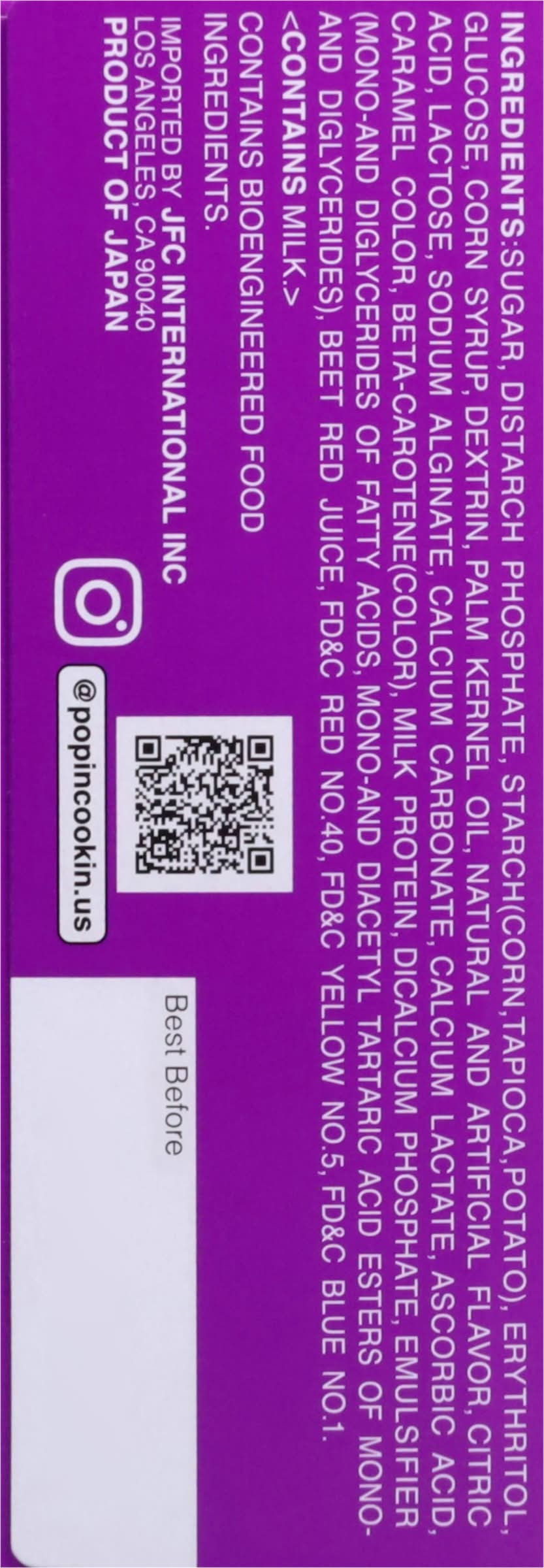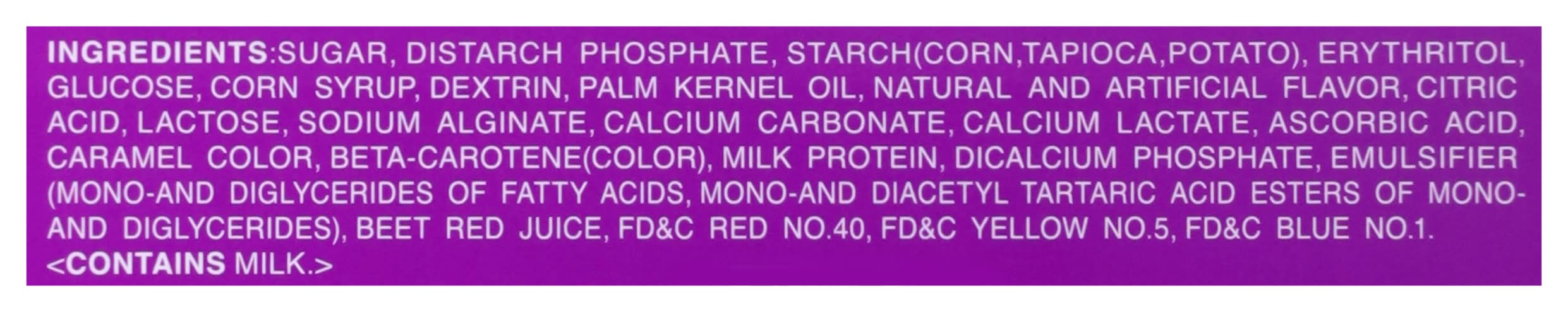 Ingredients: Sugar, Distarch Phosphate, Starch (Corn, Tapioca, Potato), Erythritol, Glucose, Corn Syrup, Dextrin, Palm Kernel Oil, Natural and Artificial Flavor, Citric Acid, Lactose, Sodium Alginate, Calcium Carbonate, Calcium Lactate, Ascorbic Acid, Caramel Color, Beta-Carotene(Color), Milk Protein, Dicalcium Phosphate, Emulsifier (Mono-and Diglycerides of Fatty Acids, Mono-and Diacetyl Tartaric Acid Esters of Mono and Diglycerides), Beet Red Juice, FD&C Red No. 40, FD&C Yellow No. 5, FD&C Blue No. 1 Contains: Corn, Lactose, Milk