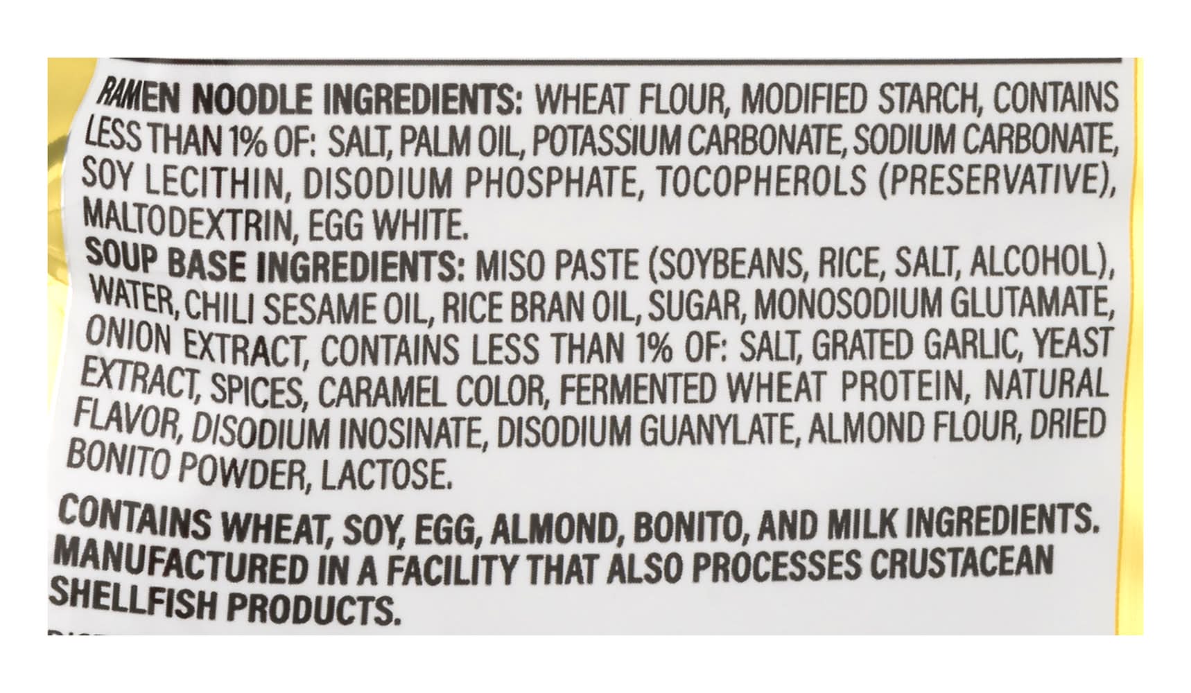 Ingredients: Ramen Noodle Ingredients: Wheat Flour, Modified Starch, Contains Less than 1% of: Salt, Palm Oil, Potassium Carbonate, Sodium Carbonate, Soy Lecithin, Disodium Phosphate, Tocopherols (Preservative), Maltodextrin, Egg White. Soup Base Ingredients: Miso Paste (Soybeans Rice Salt Alcohol), Water, Chili Sesame Oil, Rice Bran Oil, Sugar, Monosodium Glutamate, Onion Extract, Contains Less than 1% of Salt, Grated Garlic, Yeast Extract, Spices, Caramel Color, Fermented Wheat Protein, Natural Flavor, Disodium Inosinate, Disodium Guanylate, Almond Flour, Dried Bonito Powder, Lactose Contains: Wheat, Soybeans, Eggs, Tree Nuts, Milk, Crustacean Shellfish
