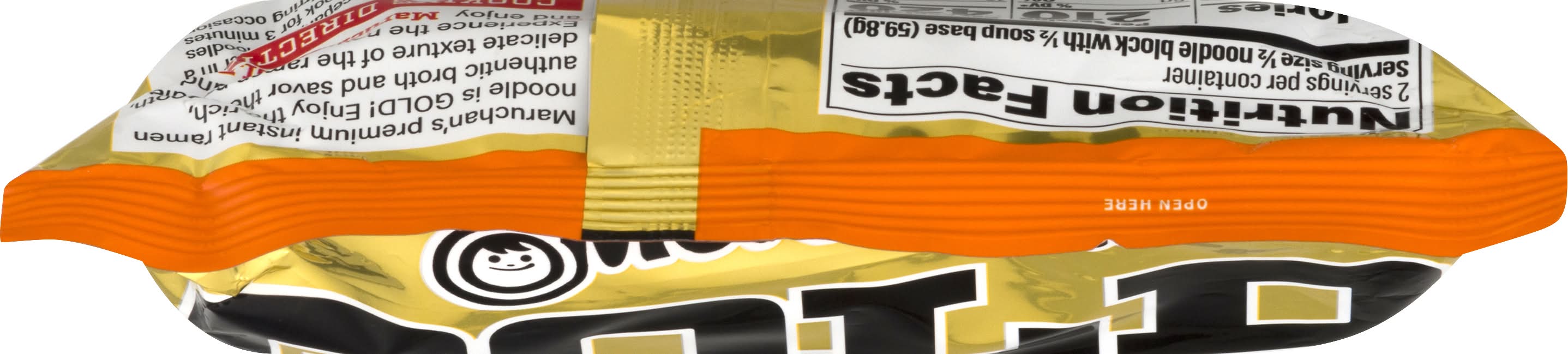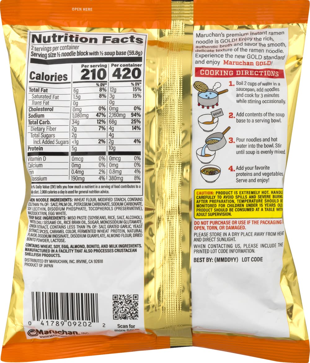 Maruchan Gold Spicy Miso Ramen Noodle is a premium instant craft ramen featuring a rich, authentic broth and smooth, delicate noodles. It is highlighted by its spicy miso flavor and stands as the new GOLD standard in Maruchan's offerings. • Flavor: Spicy miso • Number of servings: 2