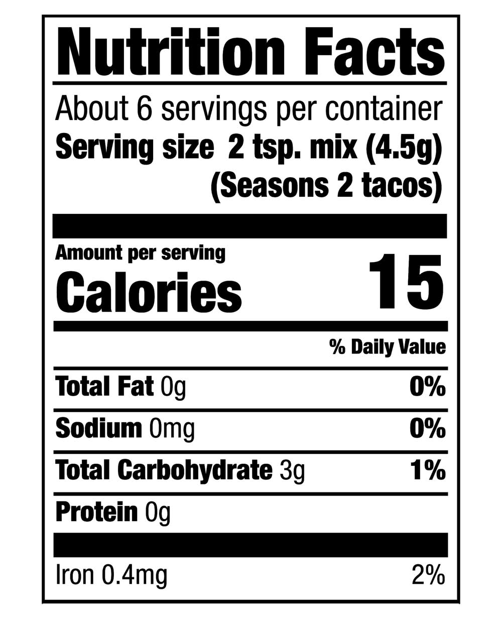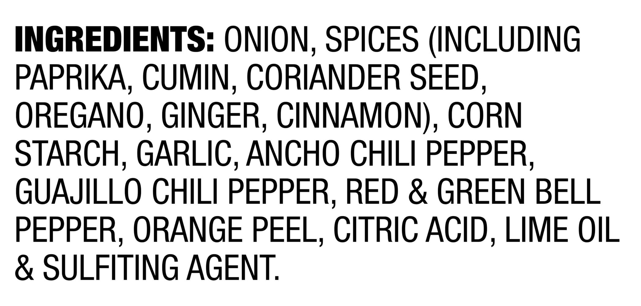 Ingredients: ONION, SPICES (INCLUDING PAPRIKA, CUMIN, CORIANDER SEED, OREGANO, GINGER, CINNAMON), CORN STARCH, GARLIC, ANCHO CHILI PEPPER, GUAJILLO CHILI PEPPER, RED GREEN BELL PEPPER, ORANGE PEEL, CITRIC ACID, LIME OIL SULFITING AGENT. Contains: Corn