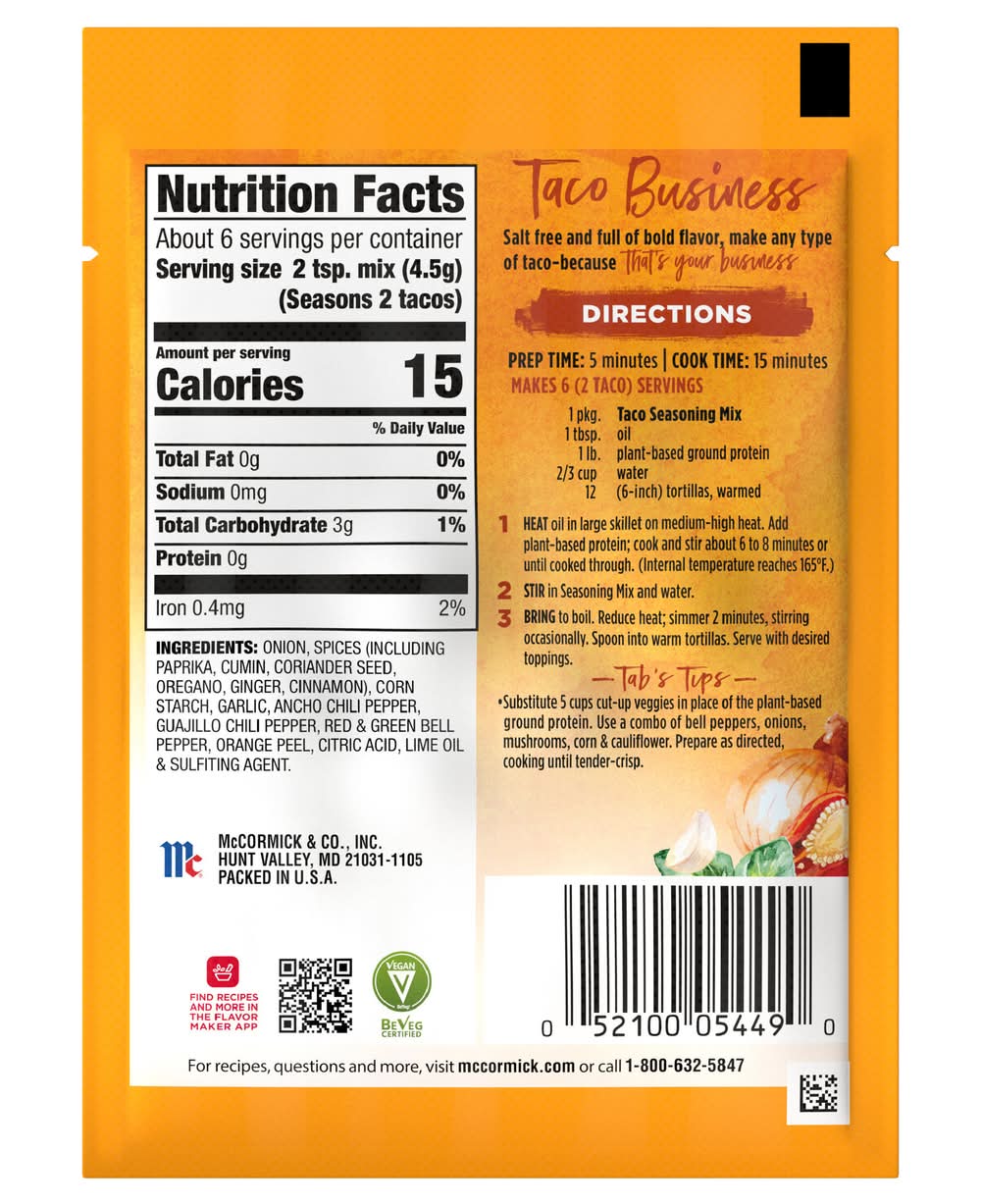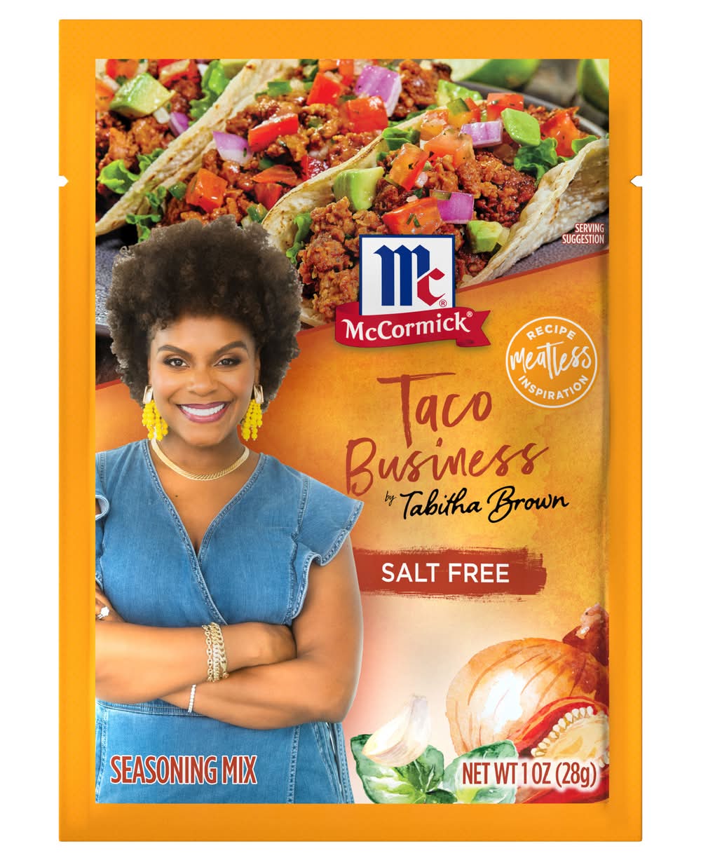 McCormick® Taco Business Seasoning Mix is salt free and full of bold flavor to make any type of taco- because that's your business. Created in partnership with Tabitha Brown, who spreads joy and warmth in her vegan-based cooking videos, it makes it easy go vegan on Taco Tuesday or every night of the week.