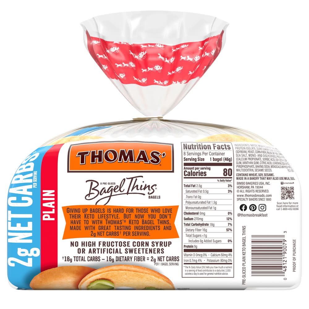 Introducing Thomas' Keto Plain Bagel Thins, 8 count, 13 oz—a delightful twist on the classic bagel that brings together comfort and in every bite. With only 2g net carbs per serving, these pre-sliced bagels are perfect for breakfast sandwiches, topped with cream cheese and lox, or simply slathered with butter for a cozy treat. Made without high fructose corn syrup or they offer a wholesome option that aligns with your keto lifestyle, making every meal feel like a special celebration. Enjoy the charm of a bagel shop from the comfort of home—perfect for savoring moments of togetherness with family and friends. Plus, our OU Kosher Parve Certification. Elevate your dining experience with the whimsical essence of Thomas' Bagel Thins, where every bite is a connection to tradition and enjoyment!