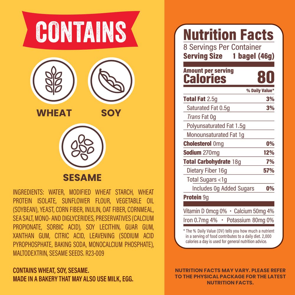 Ingredients: WATER, MODIFIED WHEAT STARCH, WHEAT PROTEIN ISOLATE, SUNFLOWER FLOUR, VEGETABLE OIL (SOYBEAN), YEAST, CORN FIBER, INULIN, OAT FIBER, CORNMEAL, SEA SALT, MONO- AND DIGLYCERIDES, PRESERVATIVES [CALCIUM PROPIONATE, SORBIC ACID], SOY LECITHIN, GUAR GUM, XANTHAN GUM, CITRIC ACID, LEAVENING [SODIUM ACID PYROPHOSPHATE, BAKING SODA, MONOCALCIUM PHOSPHATE], MALTODEXTRIN, SESAME SEEDS. Contains: CONTAINS SESAME, SOY, WHEAT.