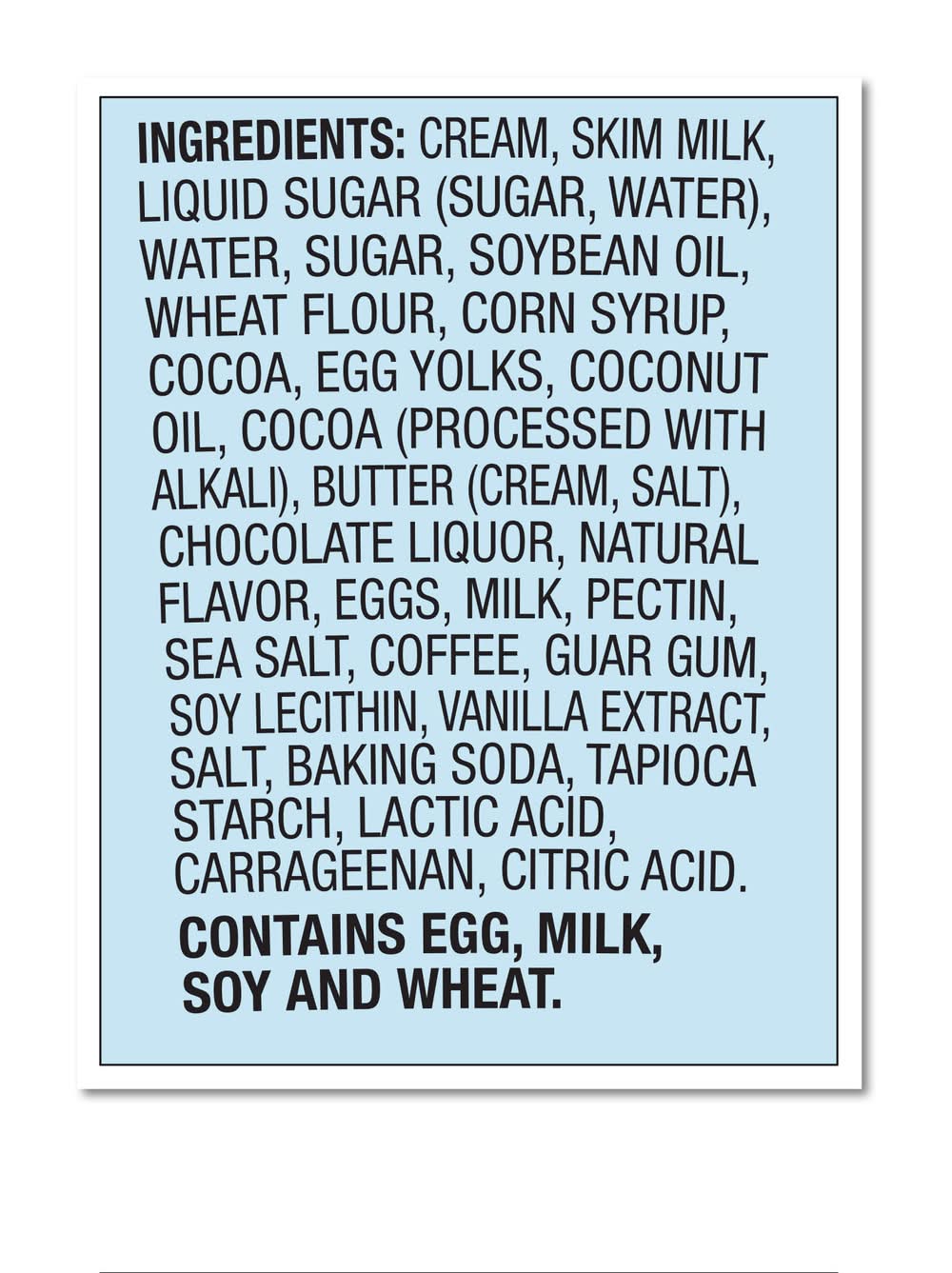 Ingredients: Cream, Skim Milk, Liquid Sugar Sugar, Water, Water, Sugar, Soybean Oil, Wheat Flour, Corn Syrup, Cocoa, Egg Yolks, Coconut Oil, Cocoa Processed with Alkali, Butter Cream, Salt, Chocolate Liquor, Natural Flavor, Eggs, Milk, Pectin, Sea Salt, Coffee, Guar Gum, Soy Lecithin, Vanilla Extract, Salt, Baking Soda, Tapioca Starch, Lactic Acid, Carrageenan, Citric Acid. Contains: Eggs, Milk, Soybeans, Wheat, Tree Nuts
