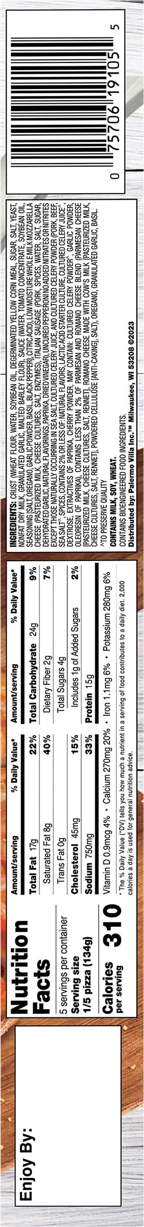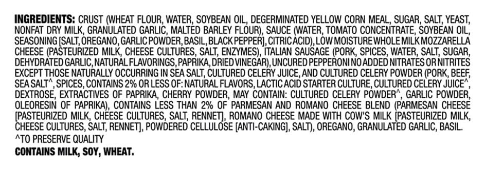 Ingredients: Crust (Wheat Flour, Water, Soybean Oil, Degerminated Yellow Corn Meal, Sugar, Salt, Yeast, Nonfat Dry Milk, Granulated Garlic, Malted Barley Flour), Low Moisture Whole Milk Mozzarella Cheese (Pasteurized Milk, Cheese Cultures, Salt, Enzymes), Sauce (Water, Tomato Concentrate, Soybean Oil, Seasoning [Salt, Oregano, Garlic Powder, Basil, Black Pepper], Citric Acid), Uncured Pepperoni No Added Nitrates or Nitrites Except Those Naturally Occurring in Sea Salt, Cultured Celery Juice, and Cultured Celery Powder (Pork, Beef, Sea Salt (to Preserve Quality), Spices, Contains 2% or Less of: Natural Flavors, Lactic Acid Starter Culture, Cultured Celery Juice (to Preserve Quality), Dextrose, Extractives of Paprika, Cherry Powder, May Contain: Cultured Celery Powder (to Preserve Quality), Garlic Powder, Oleoresin of Paprika), Contains Less than 2% of Parmesan and Romano Cheese Blend (Parmesan Cheese [Pasteurized Milk, Cheese Cultures, Salt, Rennet], Romano Cheese Made with Cow's Milk [Pasteurized Milk, Cheese Cultures, Salt, Rennet], Powdered Cellulose [Anti-Caking], Salt), Oregano, Granulated Garlic, Basil Contains: Milk, Barley, Corn, Soybeans, Wheat, Celery