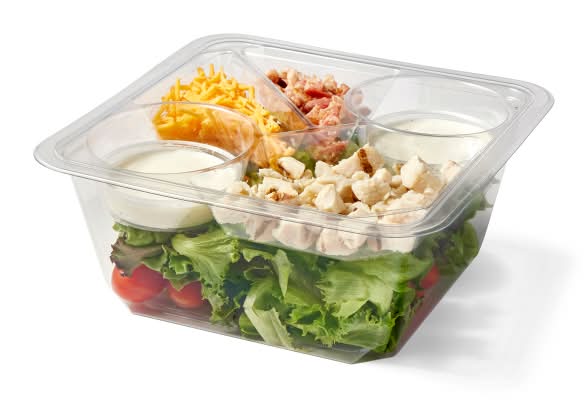 Enjoy a delightful medley of flavors with this shareable chicken BLT salad. This salad combines tender chicken breast, crispy bacon bits, fresh tomatoes, and cheddar cheese on a bed of mixed greens, all brought together with a tangy ranch dressing. It's a convenient and delicious option for a quick lunch or dinner.