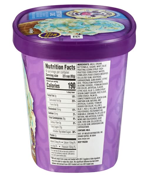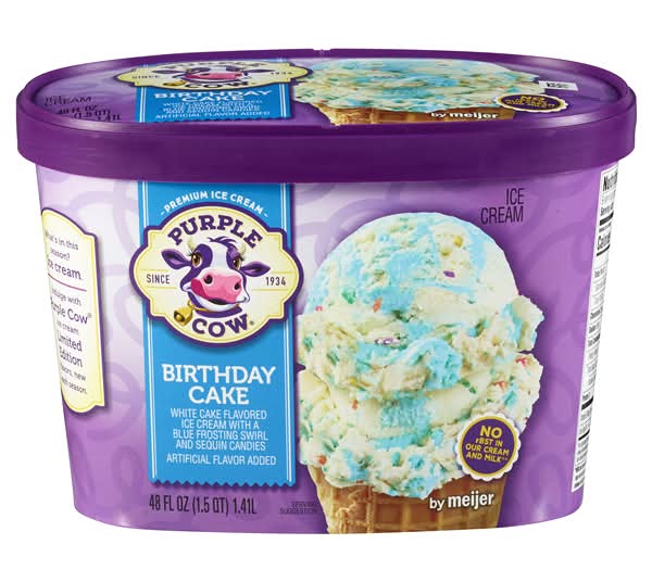 Purple Cow Birthday Cake Ice Cream is crafted with a white cake-flavored ice cream base, enriched with blue frosting swirls and sprinkled with sequin candies. This ice cream offers a festive, colorful treat that mirrors the joy of a celebratory birthday cake. Flavor: Birthday cake