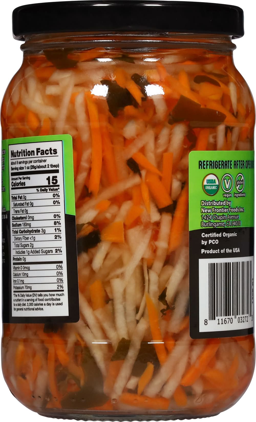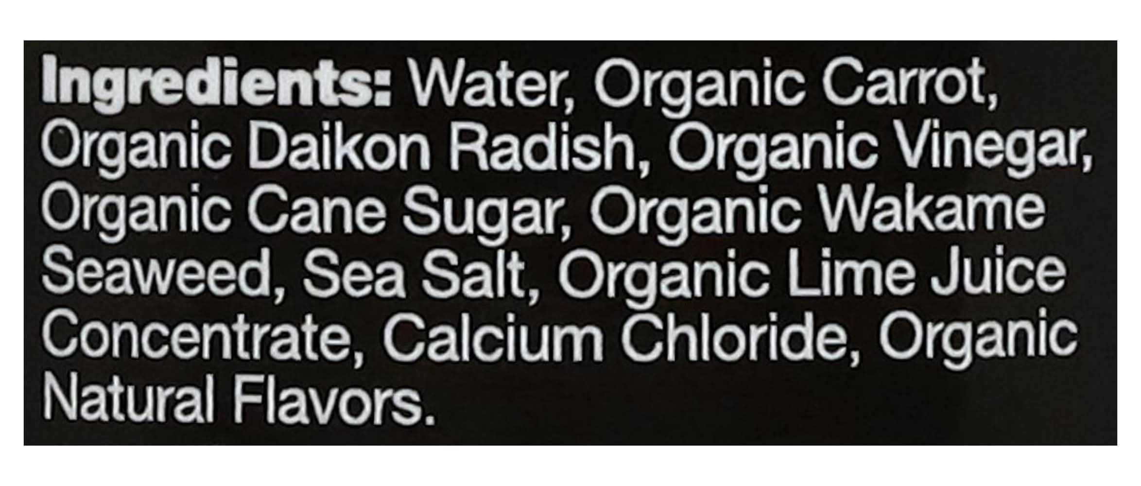 Ingredients: Water, Organic Carrot, Organic Daikon Radish, Organic Vinegar, Organic Cane Sugar, Organic Wakame Seaweed, Sea Salt, Organic Lime Juice Concentrate, Calcium Chloride, Organic Natural Flavors