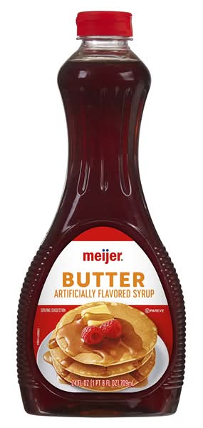 Meijer Butter Flavored Syrup offers a blend of classic syrup and butter flavors, designed to enhance pancakes and waffles with a rich taste experience. It comes in a 24 oz bottle, suitable for use as a topping to add a flavorful touch to your breakfast dishes. Flavor: Butter