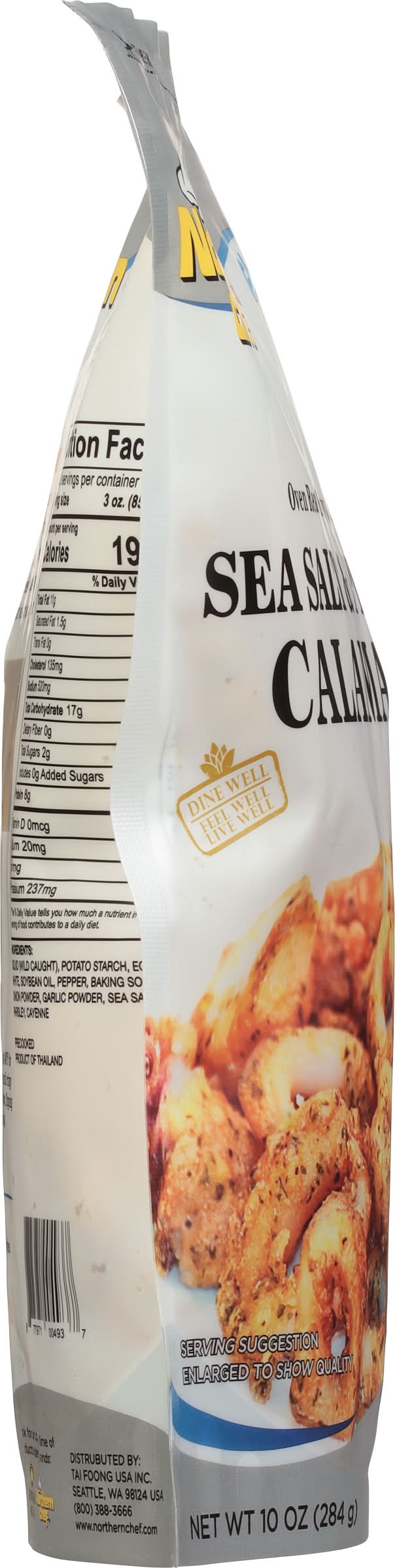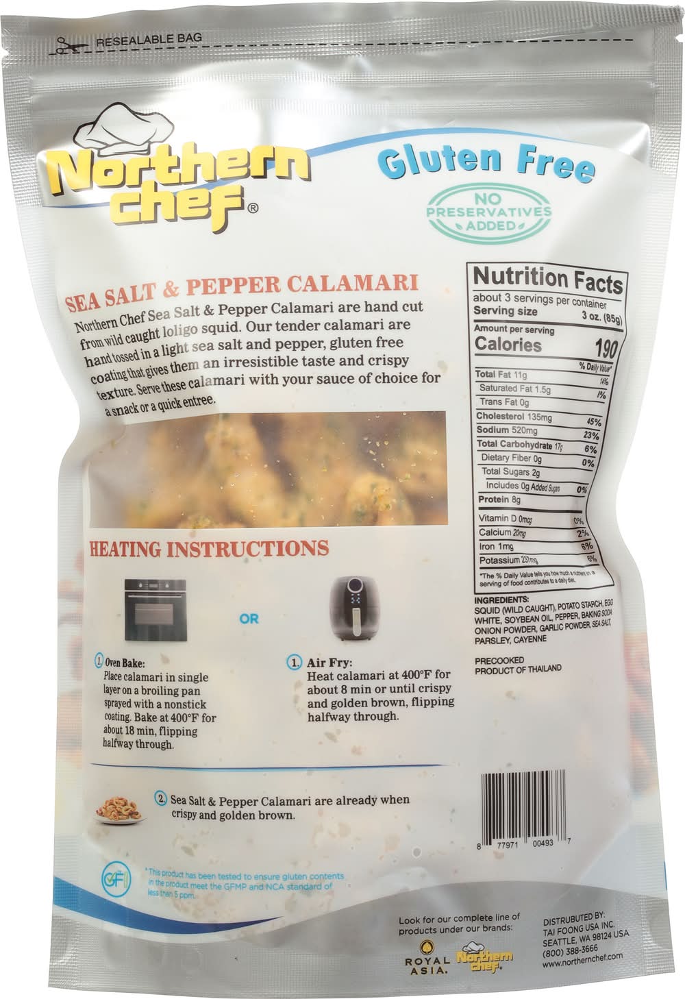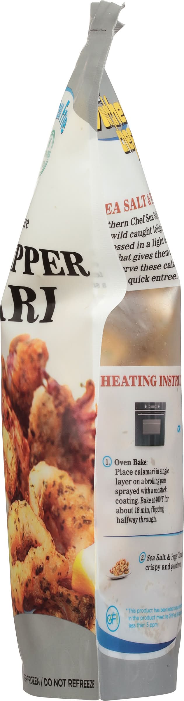 Gluten free. GFI This product has been tested to ensure gluten contents n the product meet the GFMP and NCA standard of less than 5 ppm No preservatives added. Oven ready, easy to prepare. Dine well, feel well, live well. Sea salt & pepper. Sea Salt & Pepper are hand cut from wild caught loligo squid. Our tender calamari are hand tossed in a light sea salt and pepper, gluten free coating that gives them an irresistible taste and crispy texture. Serve these calamari with your sauce of choice for a snack or as a quick entree. Precooked. Look for our complete line of products under our grands. • Flavor: Sea salt & pepper • Tai Foong USA Inc., Seattle, WA, 98124