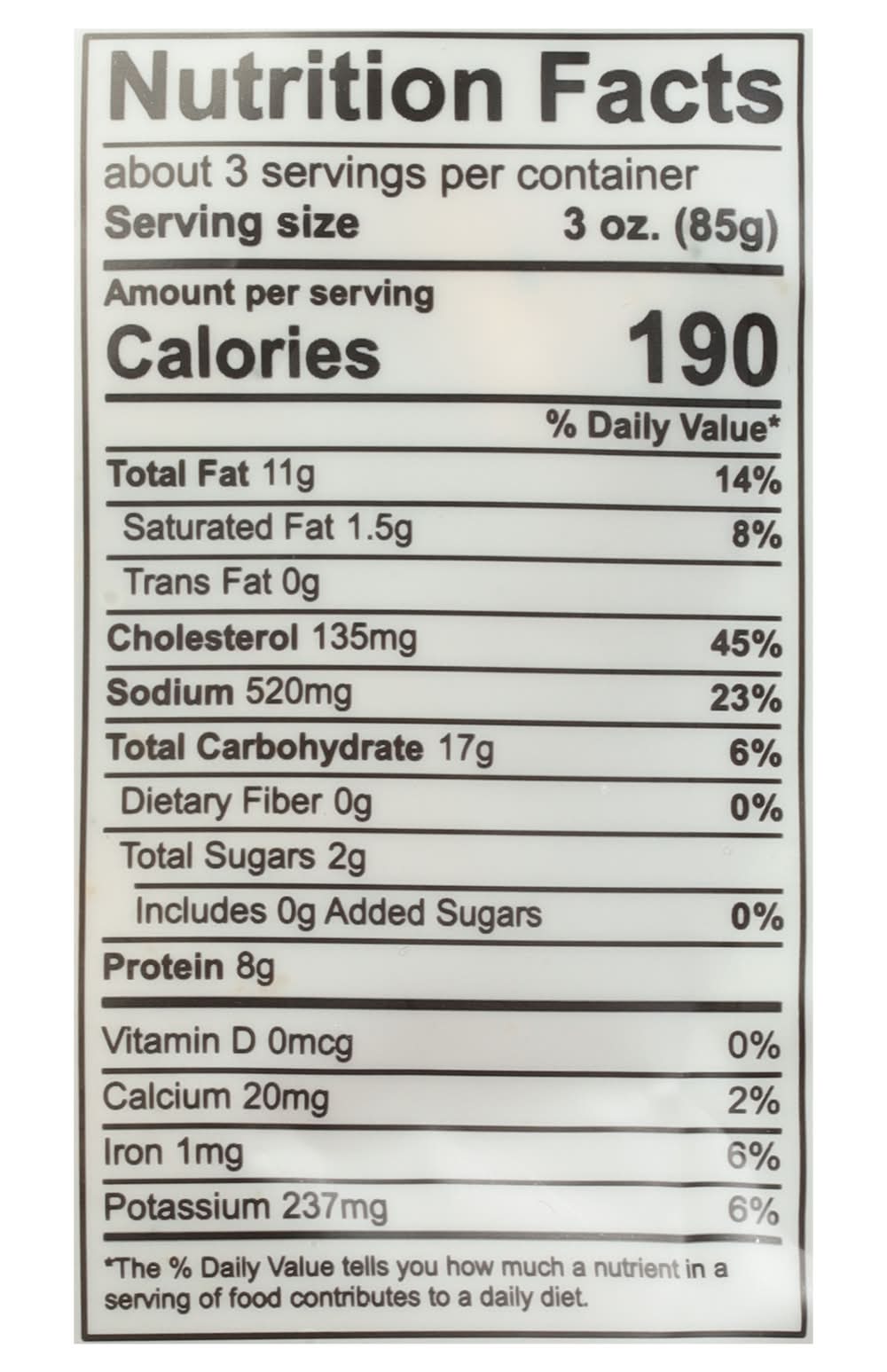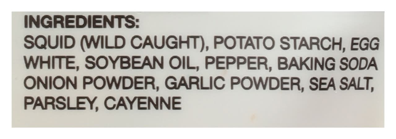 Ingredients: Squid (Wild Caught), Potato Starch, Egg White, Soybean Oil, Pepper, Baking Soda, Onion Powder, Garlic Powder, Sea Salt, Parsley, Cayenne Contains: Molluscan Shellfish, Squid (Calamari), Eggs, Soybeans