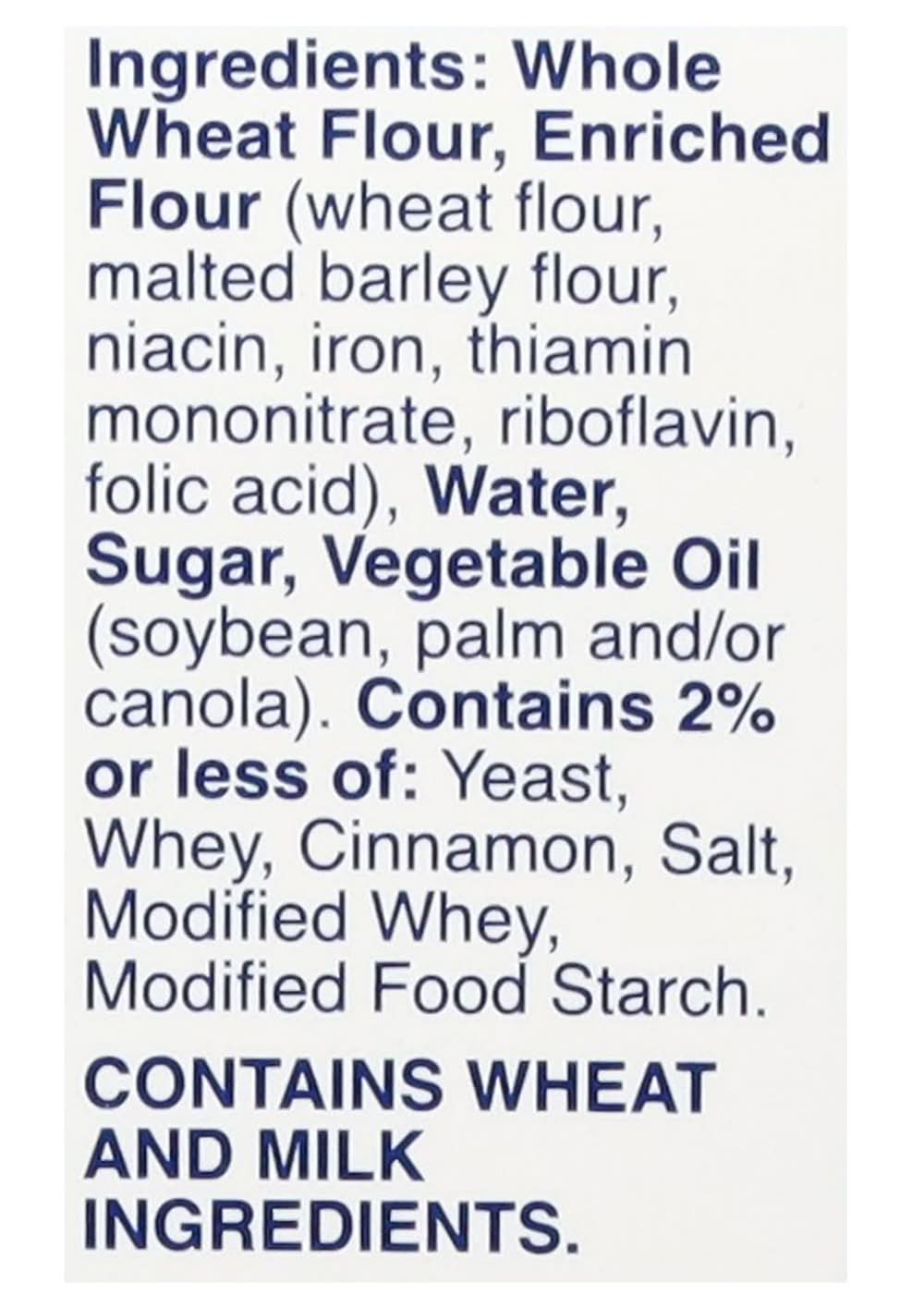 Ingredients: Whole Wheat Flour, Enriched Flour (Wheat Flour, Malted Barley Flour, Niacin, Iron, Thiamin Mononitrate, Riboflavin, Folic Acid), Water, Sugar, Vegetable Oil (Soybean, Palm and/or Canola). Contains 2% or Less of: Yeast, Whey, Cinnamon, Salt, Modified Whey, Modified Food Starch Contains: Wheat, Milk, Barley, Soybeans