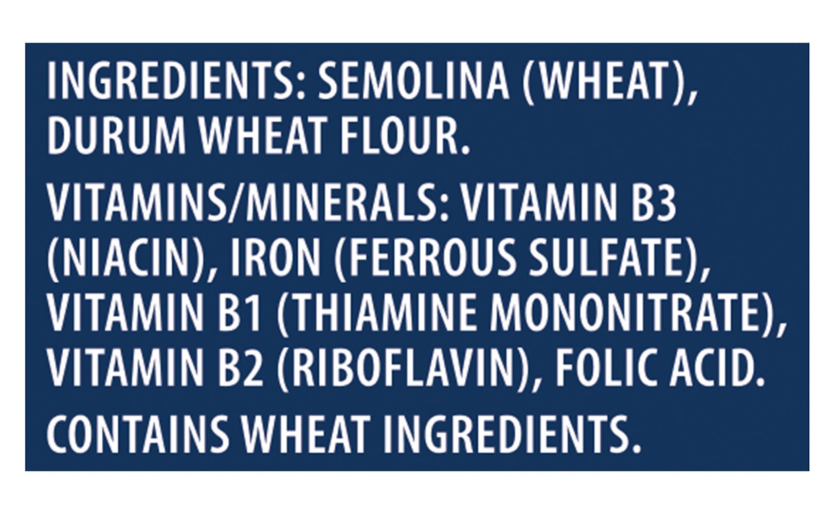 Ingredients: Semolina (Wheat), Durum Wheat Flour, Vitamins/Minerals: Vitamin B3 (Niacin), Iron (Ferrous Sulfate), Vitamin B1 (Thiamine Mononitrate), Vitamin B2 (Riboflavin), Folic Acid Contains: Wheat