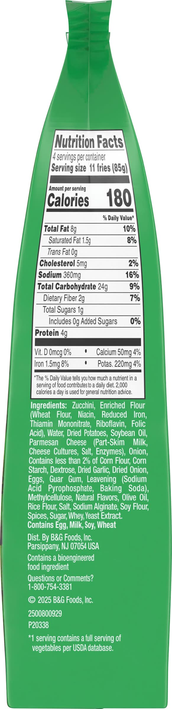 1 full serving of vegetables per serving. Contains a bioengineered food ingredient. New. Veggies never tasted so good! Our love for vegetables began over 100 years ago. At green giant, our vegetables are simply picked at their peak and flash-frozen to lock in nutrients and make meals even mightier. So spark your creative side with simple, easy-prep ingredients while discovering tasty new ways to add more veggies to your plate. Picked at the peak of perfection the goodness of veggies! has done it again, coming up with a tasty way to incorporate veggies into your lifestyle. Fries made with real vegetables, Enjoy as a delicious snack, crispy & crunchy appetizer or as a side dish that is sure to steal the spotlight. Simply heat them up and enjoy! Flavor: Zucchini garlic & parmesan