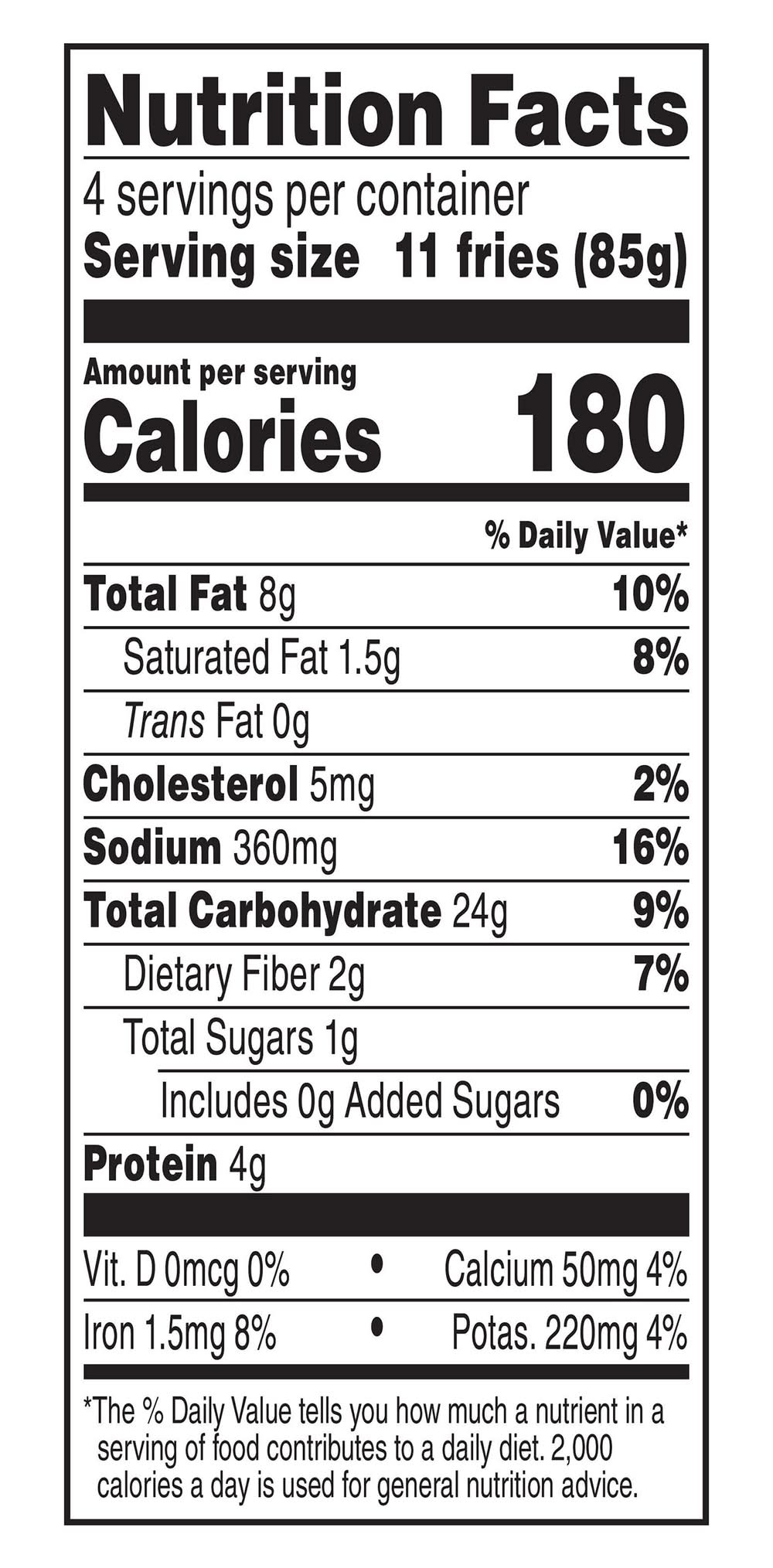 Directions for use: Directions: Must cook thoroughly. See cook instructions. Directions: For food safety and quality, follow the directions. Before eating, cook thoroughly to at least 165 degrees F. Keep frozen until ready to cook. Do not thaw. Refrigerate leftovers. Conventional Oven: Preheat oven to 425 degrees F. Lightly spray large baking sheet with non-stick spray. Bake 18 to 20 minutes or until golden and crisp. Air Fryer: Preheat air fryer to 400 degrees F. Arrange frozen vegetable fries in single layer. Cook for 10 to 12 minutes or until golden and crisp. Appliances vary. Adjust cooking times as needed. Microwave oven not recommended. Keep frozen. Storage recommendation: Keep frozen.