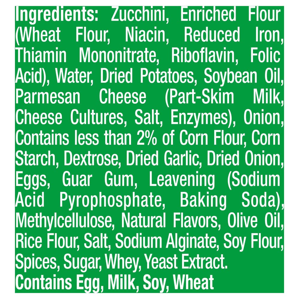 Ingredients: Zucchini, Enriched Flour (Wheat Flour, Niacin, Reduced Iron, Thiamin Mononitrate, Riboflavin, Folic Acid), Water, Dried Potatoes, Soybean Oil, Parmesan Cheese (Part-Skim Milk, Cheese Cultures, Salt, Enzymes), Onion, Contains Less than 2% of Corn Flour, Corn Starch, Dextrose, Dried Garlic, Dried Onion, Eggs, Guar Gum, Leavening (Sodium Acid Pyrophosphate, Baking Soda), Methylcellulose, Natural Flavors, Olive Oil, Rice Flour, Salt, Sodium Alginate, Soy Flour, Spices, Sugar, Whey, Yeast Extract Contains: Eggs, Milk, Soybeans, Wheat