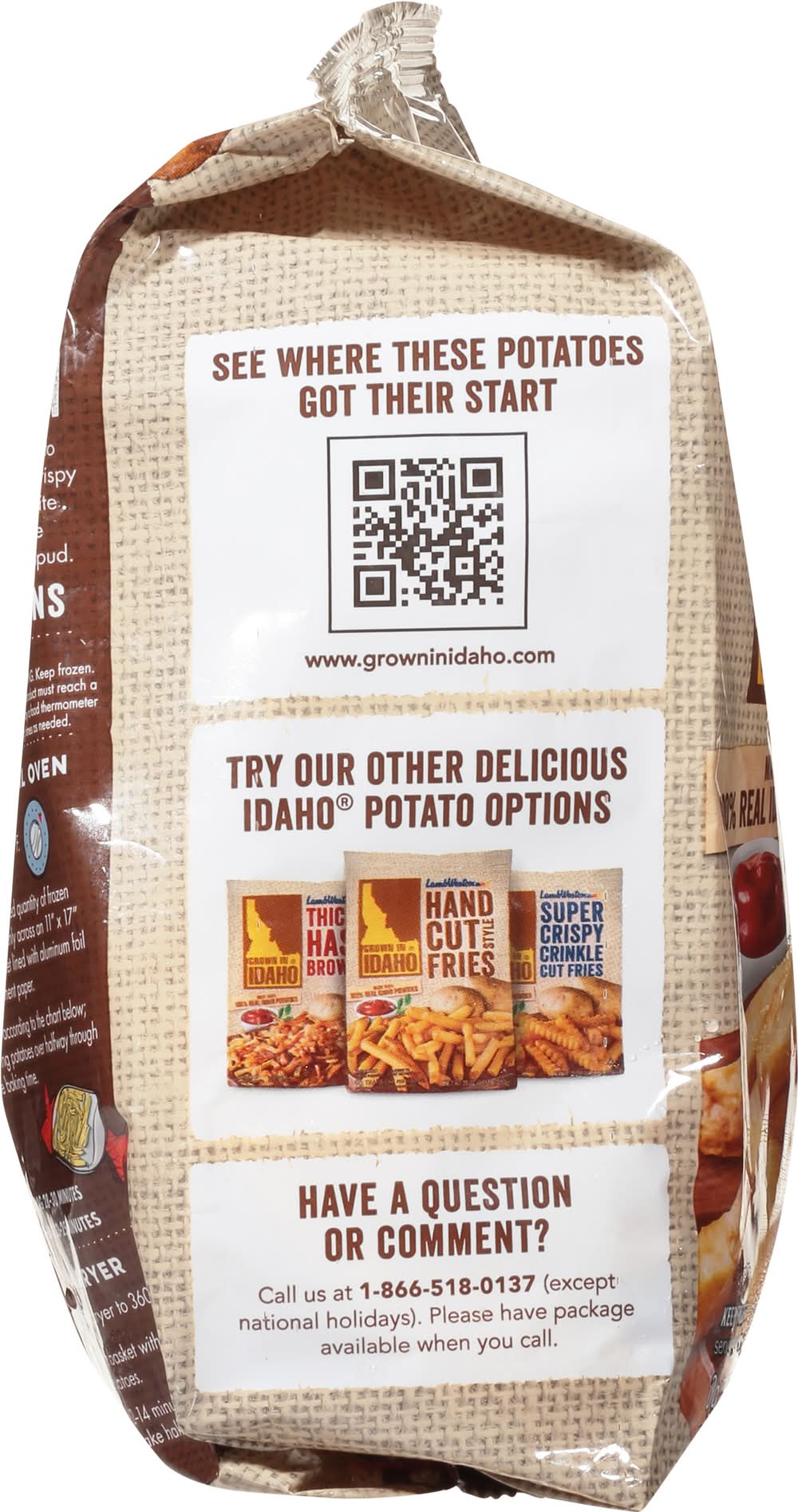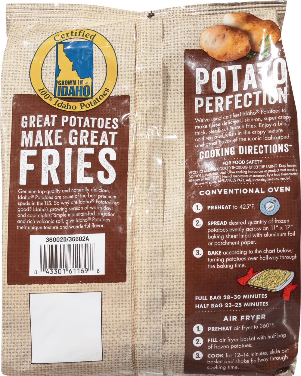 Directions for use: Bake: Cooking Directions: Conventional Oven: 1. Preheat to 425 degrees F. 2. Spread desired quantity of frozen potatoes evenly across an 11 inches x 17 inches baking sheet lined with aluminum foil or parchment paper. 3. Bake according to the chart below; turning potatoes over halfway through the baking time. Full bag 28 - 30 minutes. Half bag 23 - 25 minutes. Air Fryer: 1. Preheat air fryer to 360 degrees F. 2. Fill air fryer basket with half bag of frozen potatoes. 3. Cook for 12 - 14 minutes; slide out basket and shake halfway through cooking time. For food safety product must be cooked thoroughly before eating. Keep frozen. Do not thaw read and follow cooking instructions as product must reach a minimum of 165 degrees F (74 degrees C) internal temperature as measured by a food thermometer in several spots appliances vary. Adjust cooking times as needed. Keep frozen. Storage recommendation: Keep frozen.
