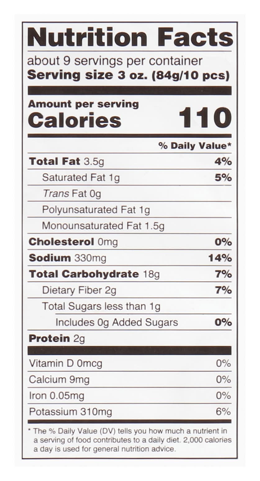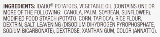Ingredients: Idaho Potatoes, Vegetable Oil (Contains One or More of the Following: Canola, Palm, Soybean, Sunflower), Modified Food Starch (Potato, Corn, Tapioca), Rice Flour, Dextrin, Salt, Leavening (Disodium Dihydrogen Pyrophosphate, Sodium Bicarbonate), Dextrose, Xanthan Gum, Color (Annatto) Contains: Soybeans