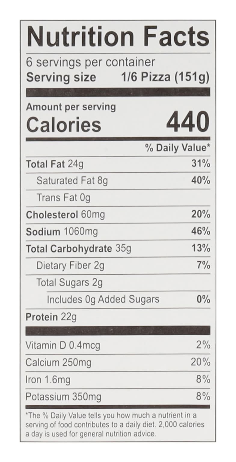 Ingredients: Crust (Wheat Flour, Water, Corn Oil, Yeast, Salt) Whole Milk Mozzarella (a) (Pasteurized Milk, Cheese Cultures, Salt, Enzymes), Sauce (Tomatoes, Salt, Water, Spices (Oregano, Black Pepper) Sausage (Pork, Salt, Spices, Flavorings) All Natural* Uncured Bacon Topping Fully Cooked Gas Flushed (No Nitrites or Nitrates Added Except Those Naturally Occurring in Sea Salt and Cultured Celery Juice, Not Preserved, Pork, Water, Sea Salt, Cane Sugar, Cultured Celery Juice, Natural Flavors) No Artificial Ingredients, All Ingredients Are Minimally Processed, All Natural* Uncured Pepperoni (No Nitrites or Nitrates Added Except for Naturally Occurring in Celery Juice, and Cherry Powder, Pork, Salt, Contains 2% or Less of Turbinado Sugar, Spices, Flavoring, Celery Juice Powder, Cherry Powder, Lactic Acid Starter Culture, Oleoresin of Paprika, Lime Juice Concentrate) *Minimally Processed, No Artificial Ingredients. (a) Cheese from Milk of Cows Not Treated with Ibst, No Significant Difference Has Been Shown Between Milk Derived from Rbst Treated and Non-Bst Treated Cows Contains: Wheat, Milk, Celery, Corn