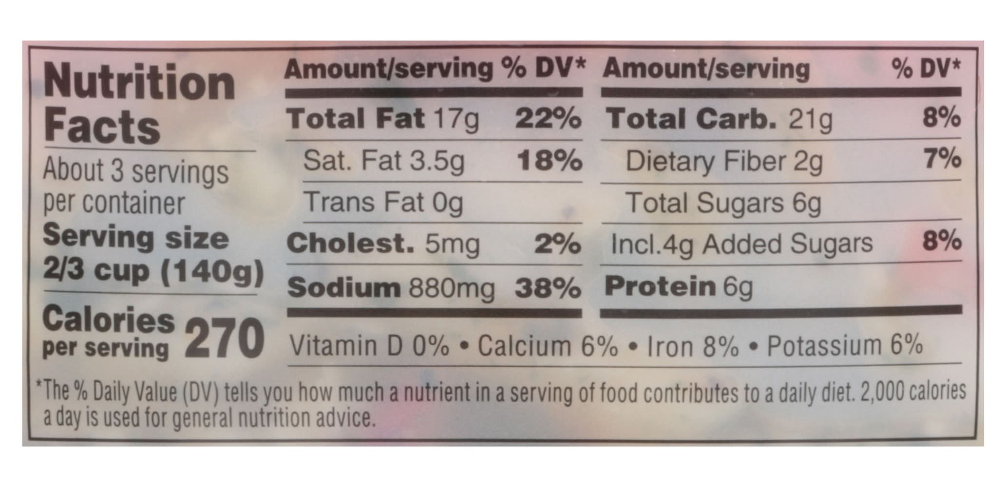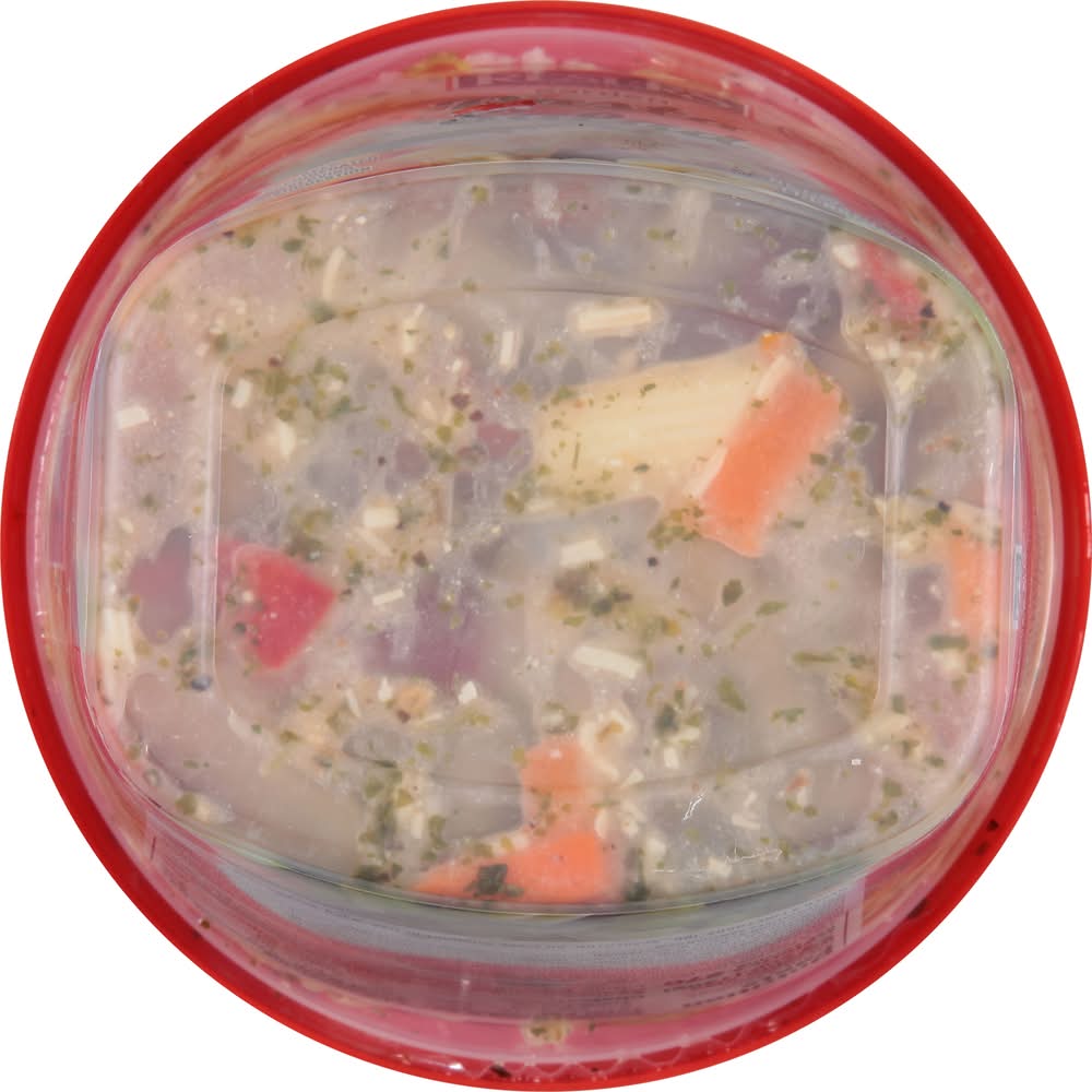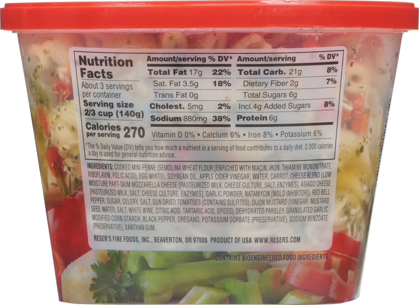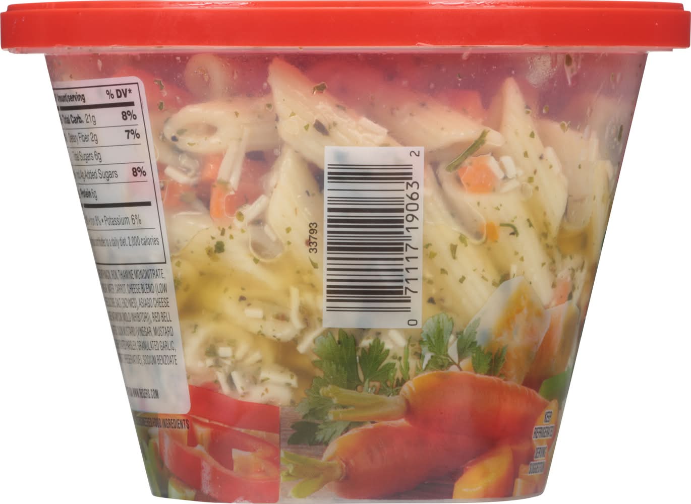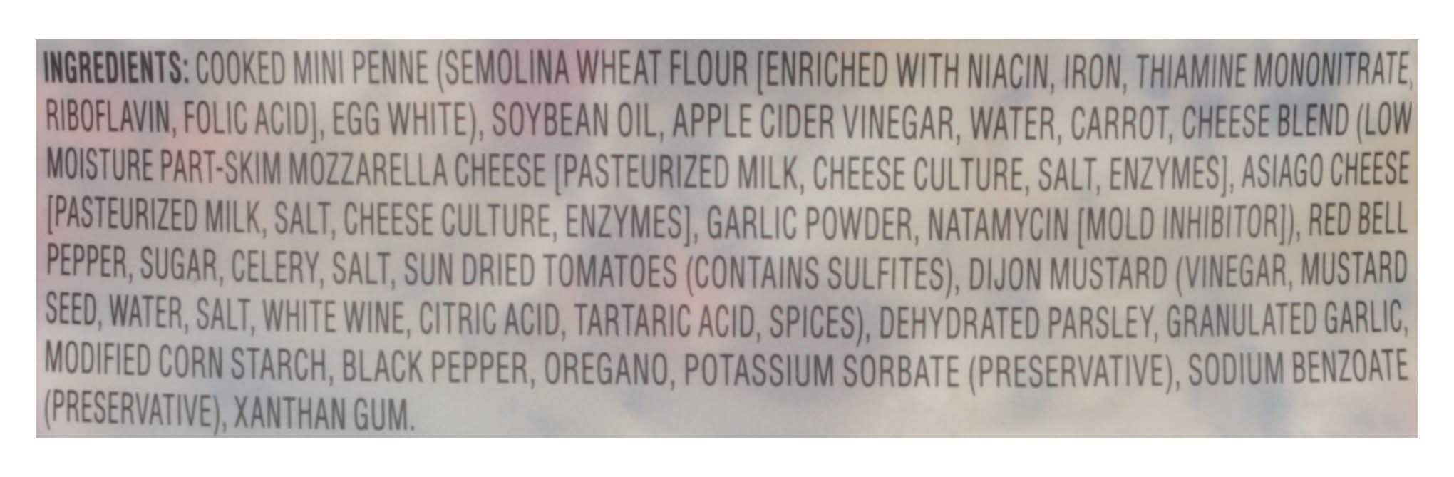 Ingredients: Cooked Mini Penne (Semolina Wheat Flour [Enriched with Niacin, Iron, Thiamine Mononitrate, Riboflavin, Folic Acid], Egg White), Soybean Oil, Apple Cider Vinegar, Water, Carrot, Cheese Blend (Low Moisture Part-Skim Mozzarella Cheese [Pasteurized Milk, Cheese Culture, Salt, Enzymes], Asiago Cheese [Pasteurized Milk, Salt, Cheese Culture, Enzymes], Garlic Powder, Natamycin [Mold Inhibitor]), Red Bell Pepper, Sugar, Celery, Salt, Sun Dried Tomatoes (Contains Sulfites), Dijon Mustard (Vinegar, Mustard Seed, Water, Salt, White Wine, Citric Acid, Tartaric Acid, Spices), Dehydrated Parsley, Granulated Garlic, Modified Corn Starch, Black Pepper, Oregano, Potassium Sorbate (Preservative), Sodium Benzoate (Preservative), Xanthan Gum Contains: Wheat, Eggs, Soybeans, Milk