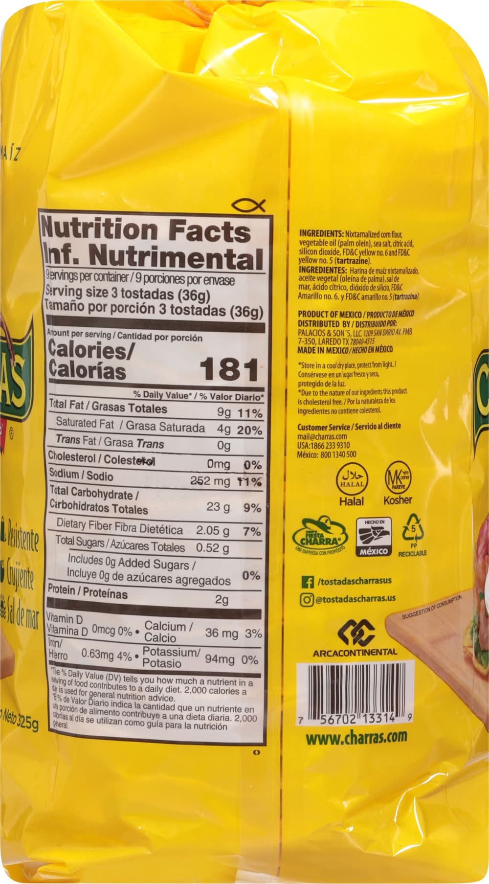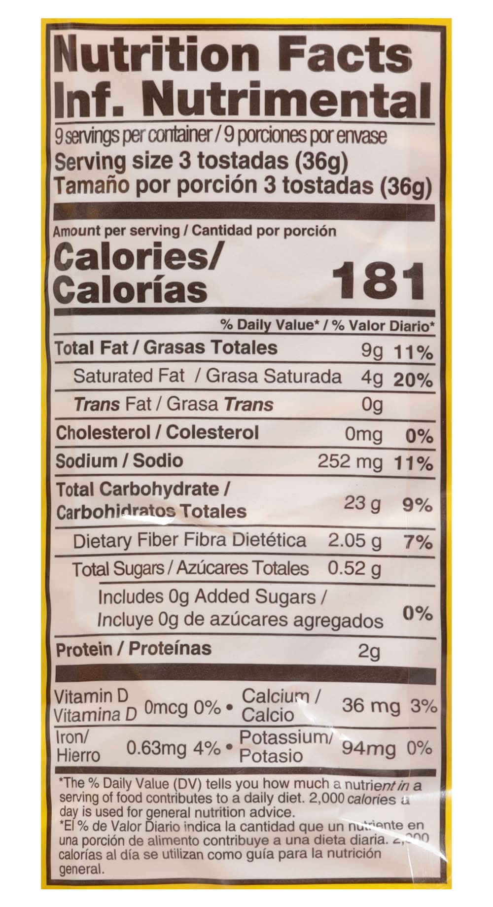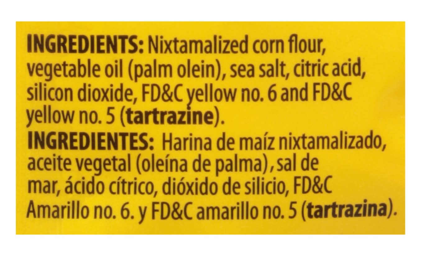 Ingredients: Nixtamalized Corn Flour, Vegetable Oil (Palm Olein), Sea Salt, Citric Acid, Silicon Dioxide, FD&C Yellow No. 6 and FD&C Yellow No. 5 (Tartrazine) Contains: Corn