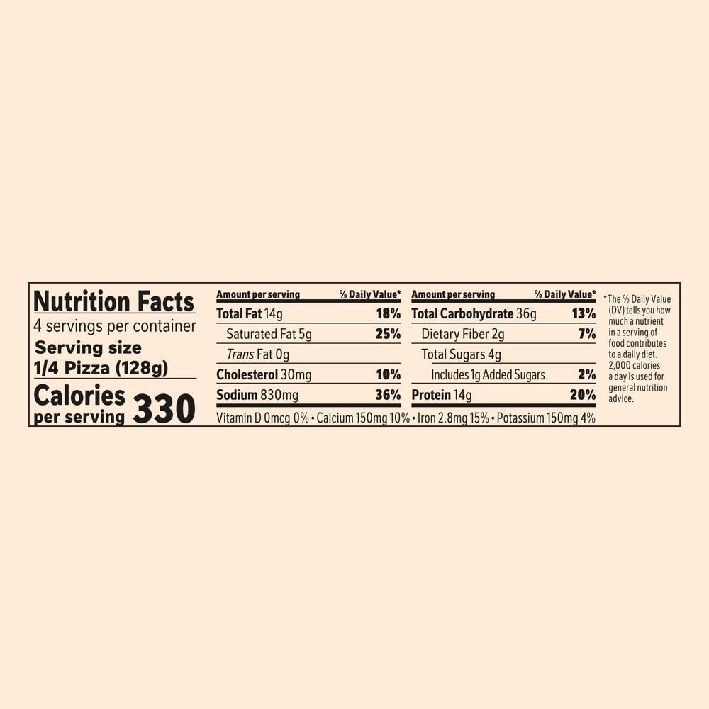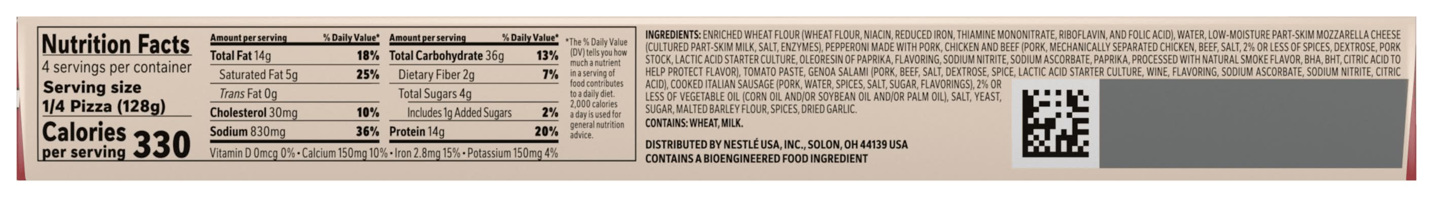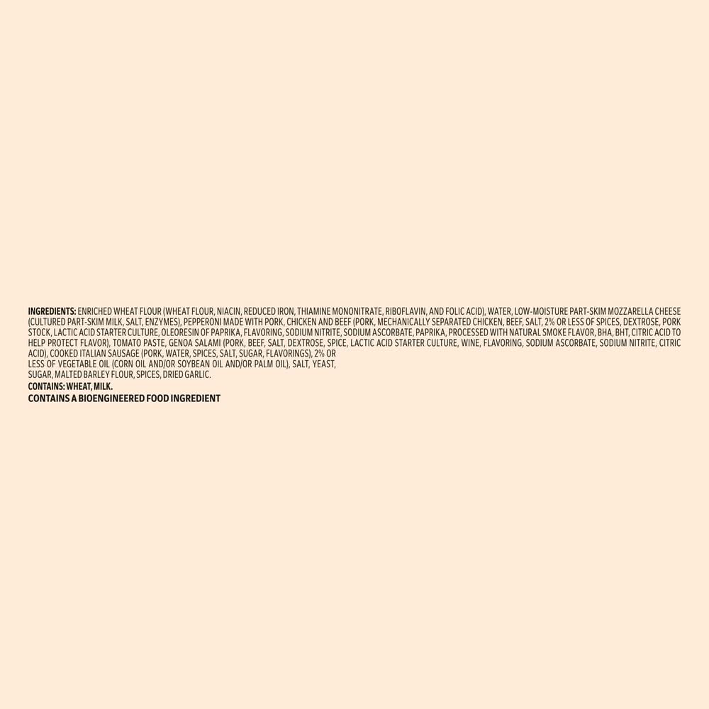 Ingredients: ENRICHED WHEAT FLOUR (WHEAT FLOUR, NIACIN, REDUCED IRON, THIAMINE MONONITRATE, RIBOFLAVIN, AND FOLIC ACID), WATER, LOW-MOISTURE PART-SKIM MOZZARELLA CHEESE (CULTURED PART-SKIM MILK, SALT, ENZYMES), PEPPERONI MADE WITH PORK, CHICKEN AND BEEF (PORK, MECHANICALLY SEPARATED CHICKEN, BEEF, SALT, 2% OR LESS OF SPICES, DEXTROSE, PORK STOCK, LACTIC ACID STARTER CULTURE, OLEORESIN OF PAPRIKA, FLAVORING, SODIUM NITRITE, SODIUM ASCORBATE, PAPRIKA, PROCESSED WITH NATURAL SMOKE FLAVOR, BHA, BHT, CITRIC ACID TO HELP PROTECT FLAVOR), TOMATO PASTE, GENOA SALAMI (PORK, BEEF, SALT, DEXTROSE, SPICE, LACTIC ACID STARTER CULTURE, WINE, FLAVORING, SODIUM ASCORBATE, SODIUM NITRITE, CITRIC ACID), COOKED ITALIAN SAUSAGE (PORK, WATER, SPICES, SALT, SUGAR, FLAVORINGS), 2% OR LESS OF VEGETABLE OIL (CORN OIL AND/OR SOYBEAN OIL AND/OR PALM OIL), SALT, YEAST, SUGAR, MALTED BARLEY FLOUR, SPICES, DRIED GARLIC. Contains: CONTAINS: WHEAT, MILK.