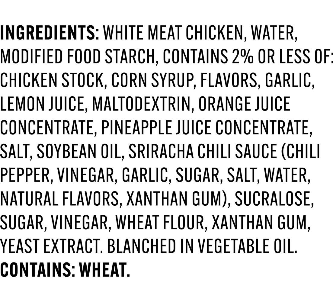 Ingredients: White Meat Chicken, Water, Modified Food Starch, Contains 2% Or Less Of: Chicken Stock, Corn Syrup, Flavors, Garlic, Lemon Juice, Maltodextrin, Orange Juice Concentrate, Pineapple Juice Concentrate, Salt, Soybean Oil, Sriracha Chili Sauce (Chili Pepper, Vinegar, Garlic, Sugar, Salt, Water, Natural Flavors, Xanthan Gum), Sucralose, Sugar, Vinegar, Wheat Flour, Xanthan Gum, Yeast Extract. Blanched In Vegetable Oil. Contains: Wheat