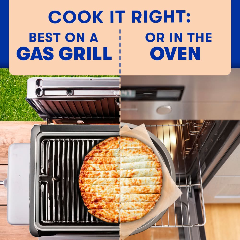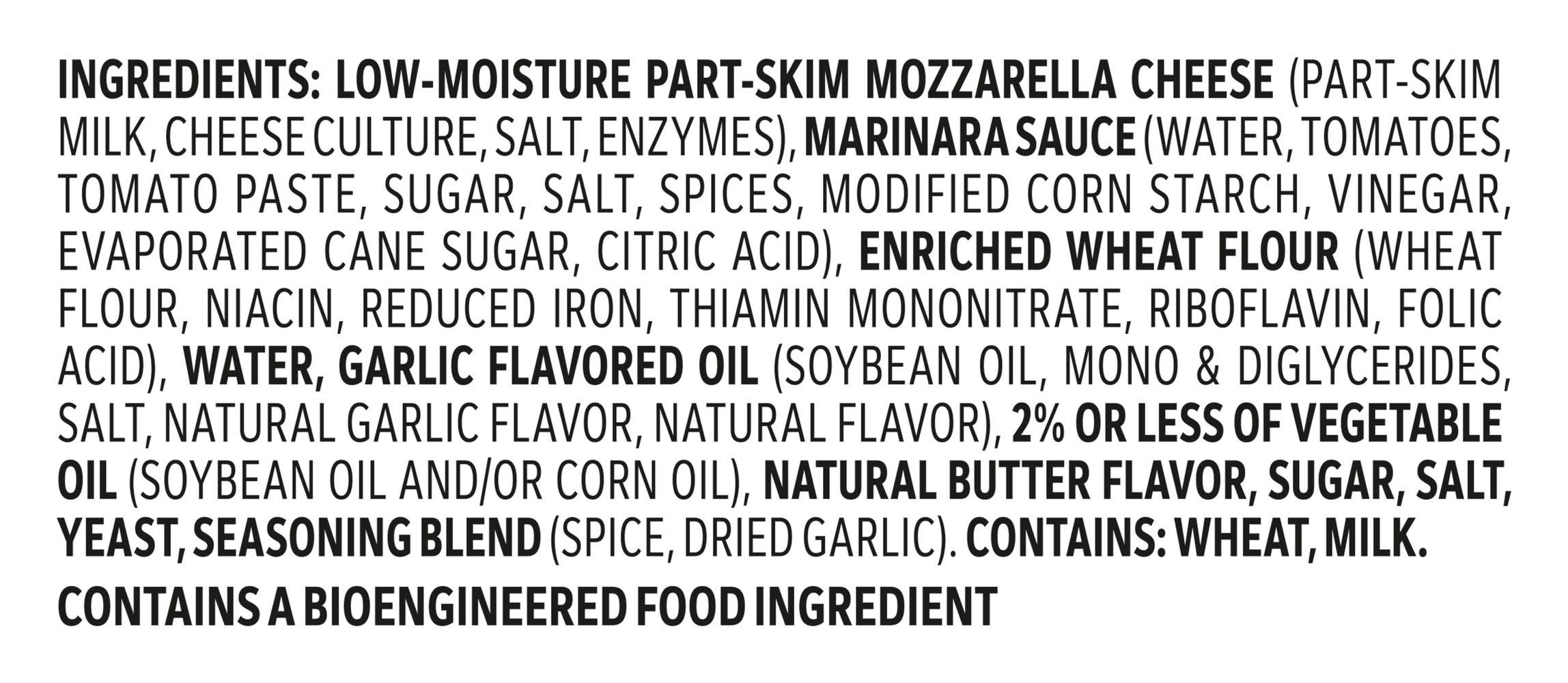 Ingredients: LOW-MOISTURE PART-SKIM MOZZARELLA CHEESE (PART-SKIM MILK, CHEESE CULTURE, SALT, ENZYMES), MARINARA SAUCE (WATER, TOMATOES, TOMATO PASTE, SUGAR, SALT, SPICES, MODIFIED CORN STARCH, VINEGAR, EVAPORATED CANE SUGAR, CITRIC ACID), ENRICHED WHEAT FLOUR (WHEAT FLOUR, NIACIN, REDUCED IRON, THIAMIN MONONITRATE, RIBOFLAVIN, FOLIC ACID), WATER, GARLIC FLAVORED OIL (SOYBEAN OIL, MONO DIGLYCERIDES, SALT, NATURAL GARLIC FLAVOR, NATURAL FLAVOR), 2% OR LESS OF VEGETABLE OIL (SOYBEAN OIL AND/OR CORN OIL), NATURAL BUTTER FLAVOR, SUGAR, SALT, YEAST, SEASONING BLEND (SPICE, DRIED GARLIC), . Contains: Milk, Wheat, Soy