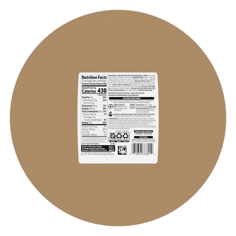 Directions for use: Directions: Preheat Oven to 425 degrees F. Remove pizza from overwrap and cardboard. Set marinara packet aside. Place pizza on center oven rack. Oven temperatures may vary so adjust oven temperature and baking time as necessary. Oven: Bake pizza for 10 minutes or until cheese is melted and edges are golden brown. Gas Grill: Cook pizza at 400 degrees F for 13 minutes with lid closed. Cook for 7 minutes & rotate 1/2 turn, continue cooking. Cook thoroughly. Cooking Directions: Product must be cooked thoroughly to 165 degrees F for food safety and quality. Do not allow product to thaw. Do not eat without cooking. Because Jack's Pizza bakes up delicious and hot, please use care when handling the pizza. Let stand 5 minutes before enjoying. Keep frozen. Storage recommendation: Keep frozen.