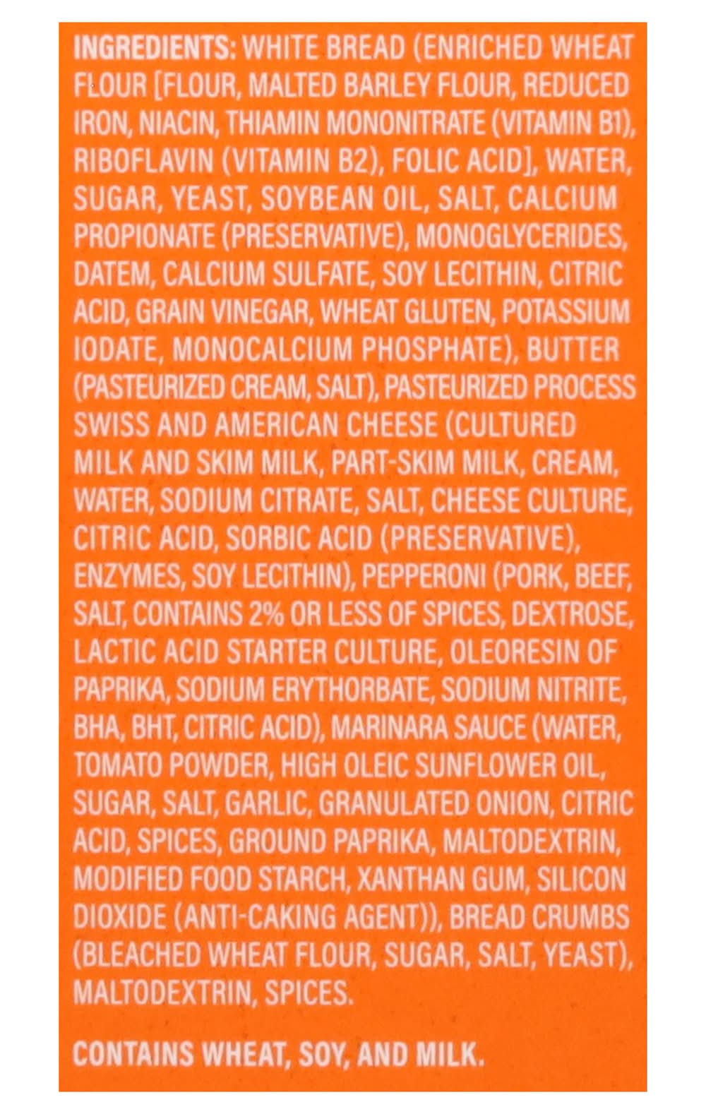 Ingredients: White Bread (Enriched Wheat Flour [Flour, Malted Barley Flour, Reduced Iron, Niacin, Thiamin Mononitrate, (Vitamin B1), Riboflavin (Vitamin B2), Folic Acid], Water, Sugar, Yeast, Soybean Oil, Salt, Calcium Propionate (Preservative), Monoglycerides, DATEM, Calcium Sulfate, Soy Lecithin, Citric Acid, Grain Vinegar, Wheat Gluten, Potassium Iodate, Monocalcium Phosphate), Butter (Pasteurized Cream, Salt), Pasteurized Process Swiss and American Cheese (Cultured Milk and Skim Milk, Part-Skim Milk, Cream, Water, Sodium Citrate, Salt, Cheese Culture, Citric Acid, Sorbic Acid (Preservative), Enzymes, Soy Lecithin), Pepperoni (Pork, Beef, Salt, Contains 2% or Less of Spices, Dextrose, Lactic Acid Starter Culture, Oleoresin of Paprika, Sodium Erythorbate, Sodium Nitrite, BHA, BHT, Citric Acid), Marinara Sauce (Water, Tomato Powder, High Oleic Sunflower Oil, Sugar, Salt, Garlic, Granulated Onion, Citric Acid, Spices, Ground Paprika, Maltodextrin, Modified Food Starch, Xanthan Gum, Silicon Dioxide (Anti-Caking Agent)), Bread Crumbs (Bleached Wheat Flour, Sugar, Salt, Yeast), Maltodextrin Spices Contains: Wheat, Soybeans, Milk, Barley, Gluten