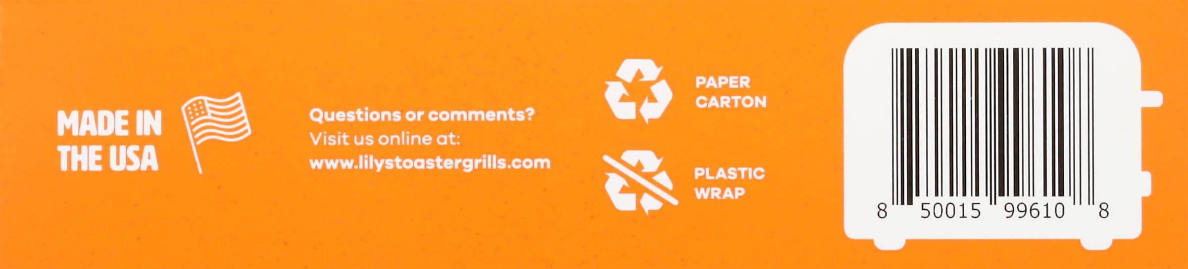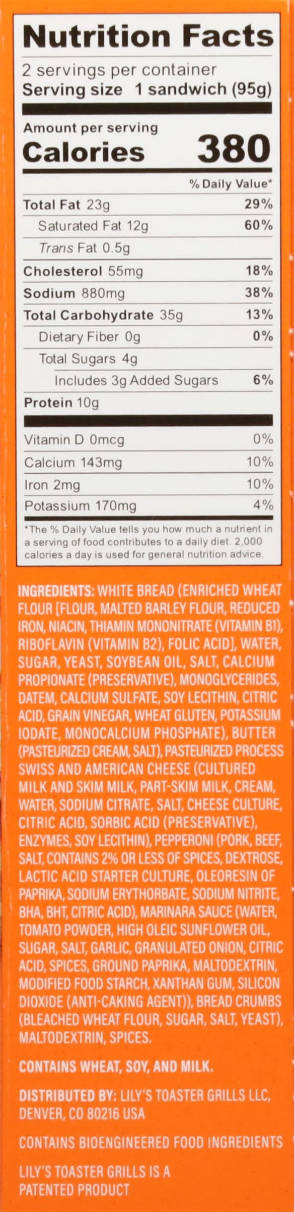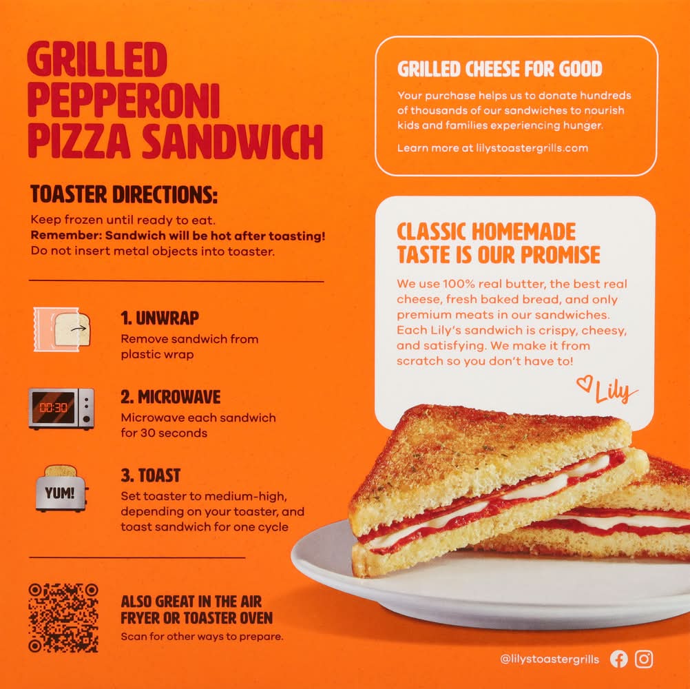 On seasoned buttered bread with premium pepperoni and marinara. Contains bioengineered food ingredients. Made with love. Homemade goodness. Hot & crispy from your toaster. No prep, no mess. Ready in minutes. Goodness in every sandwich & everything we do. Lily's founders are moms who believe in nourishing families with high-quality ingredients like fresh-baked bread, wholesome cheese, and real butter. Each Lily's sandwich is hot, crispy, and satisfying. • Lily's Toaster Grills Llc,, Denver, Co 80216 • Packaging: Reusable