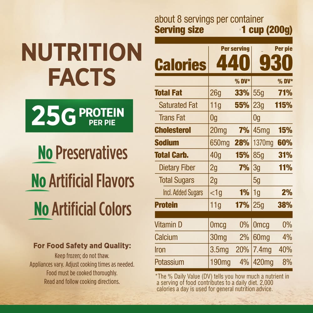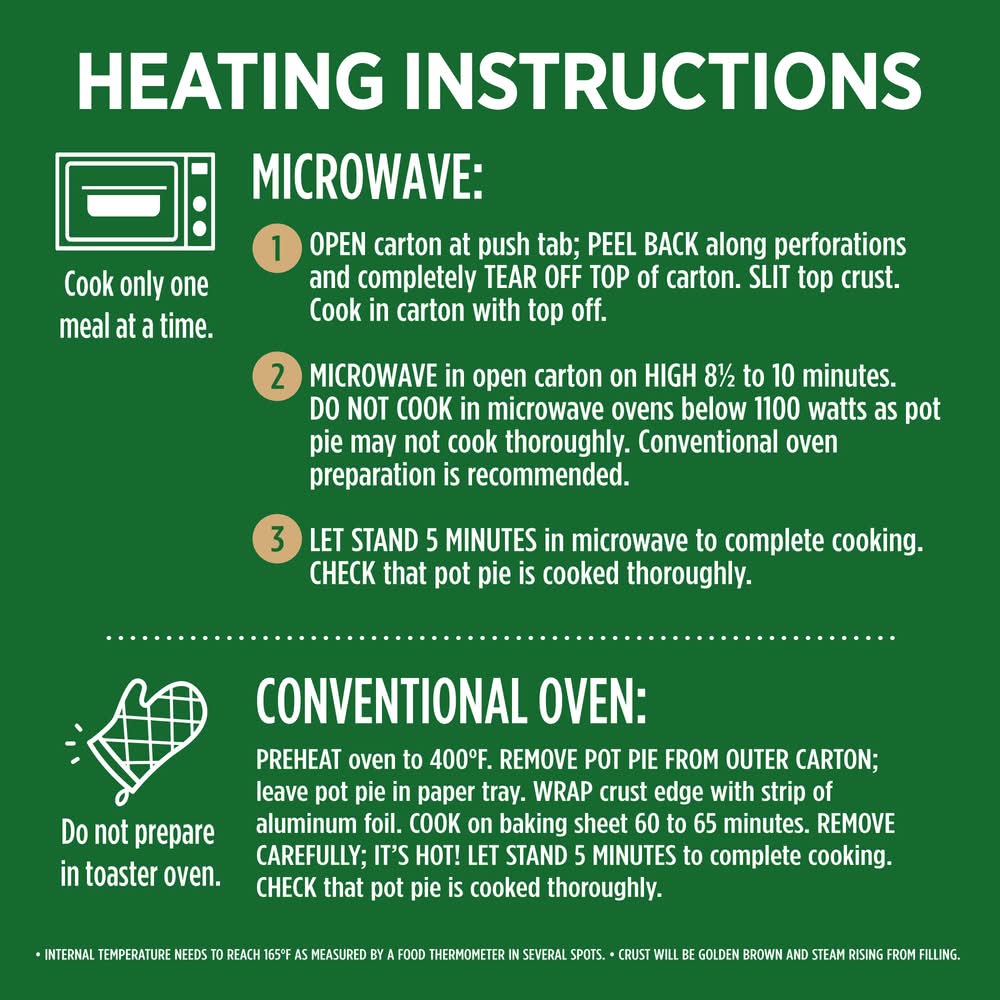Microwave oven: cook only one at a time. 1) open carton at push tab; peel back along perforations and completely tear off top of carton. slit top crust. cook in carton with top off. 2) microwave in open carton on high 8 to 10 minutes. do not cook in microwave ovens below 1100 watts as pot pie may not cook thoroughly. conventional oven preparation is recommended. let stand 5 minutes in microwave to complete cooking. remove carefully; it's hot! 3) check that pot pie is cooked thoroughly. internal temperature needs to reach 165 degrees f as measured by a food thermometer in several spots. crust will be golden brown and steam rising from filling. conventional oven: do not prepare in toaster oven. 1) preheat oven to 400 degrees f. remove pot pie from outer carton; leave pot pie in paper tray. wrap crust edge with strip of aluminum foil. 2) cook on baking sheet 60 to 65 minutes. remove carefully; it's hot! 3) let stand 5 minutes to complete cooking. 4) check that pot pie is cooked thoroughly. internal temperature needs to reach 165 degrees f as measured by a food thermometer in several spots. crust will be golden brown and steam rising from filling. food safety and quality: keep frozen; do not thaw. appliances vary. adjust cooking times as needed. food must be cooked thoroughly. read and follow these cooking directions. keep frozen.