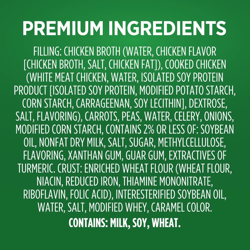 Ingredients: Filling: Chicken Broth (Water, Chicken Flavor [Chicken Broth, Salt, Chicken Fat]), Cooked Chicken (White Meat Chicken, Water, Isolated Soy Protein Product [Isolated Soy Protein, Modified Potato Starch, Corn Starch, Carrageenan, Soy Lecithin], Dextrose, Salt, Flavoring), Carrots, Peas, Water, Celery, Onions, Modified Corn Starch, Contains 2% or less of: Soybean Oil, Nonfat Dry Milk, Salt, Sugar, Methylcellulose, Flavoring, Xanthan Gum, Guar Gum, Extractives of Turmeric. Crust: Enriched Wheat Flour (Wheat Flour, Niacin, Reduced Iron, Thiamine Mononitrate, Riboflavin, Folic Acid), Interesterified Soybean Oil, Water, Salt, Modified Whey, Caramel Color. CONTAINS: MILK, SOY, WHEAT. Contains: Milk, Soy, Wheat