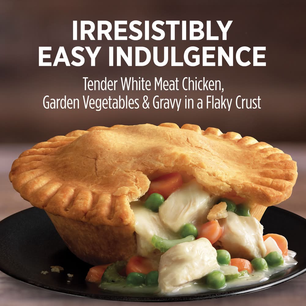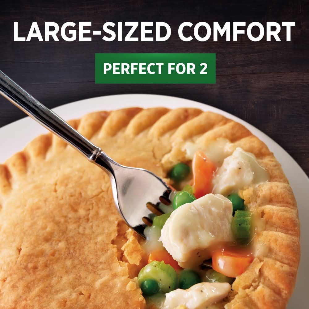 Put the taste of homemade flavor on your kitchen table with Marie Callender's Chicken Pot Pie Large Size. This satisfying and hearty frozen pot pie features chunks of tender white meat chicken and garden vegetables with savory, made-from-scratch gravy surrounded by a golden, flaky crust that's also made-from-scratch. With 4 frozen chicken pot pies in each box, your family can enjoy a homestyle microwave meal that includes 25 grams of protein with no preservatives and no artificial flavors or colors. Heat this comforting chicken pot pie in the conventional oven or microwave for an easy-to-prepare single-serve pot pie dinner that's sure to satisfy. Enjoy warm, hearty ingredients and delicious homemade comfort food taste with Marie Callender’s. Size: Large