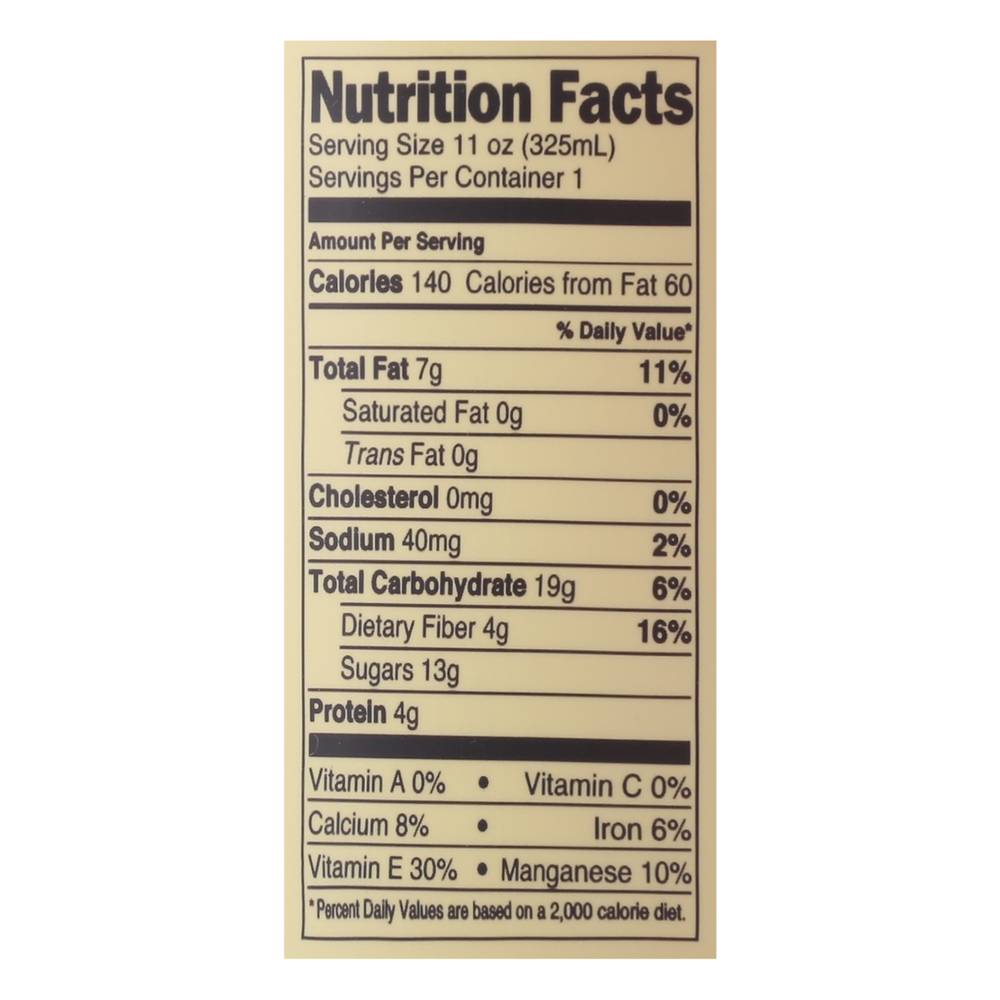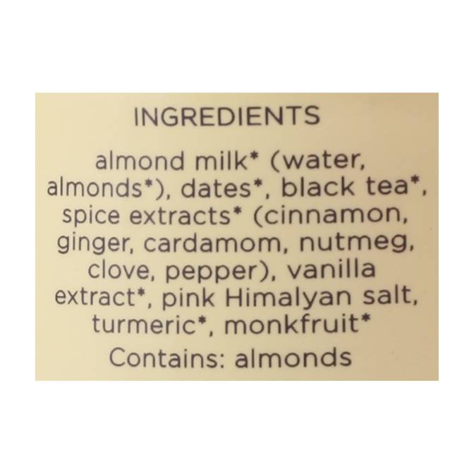 Ingredients: Almonds Milk (Organic) Water, Almond (Organic), Dates (Organic), Black Tea (Organic), Spice Extract (Organic) (Cinnamon, Ginger, Cardamom, Nutmeg, Clove, Pepper), Vanilla Extract (Organic), Pink Himalayan Salt, Turmeric (Organic), Monkfruit (Organic). Contains: Tree Nuts
