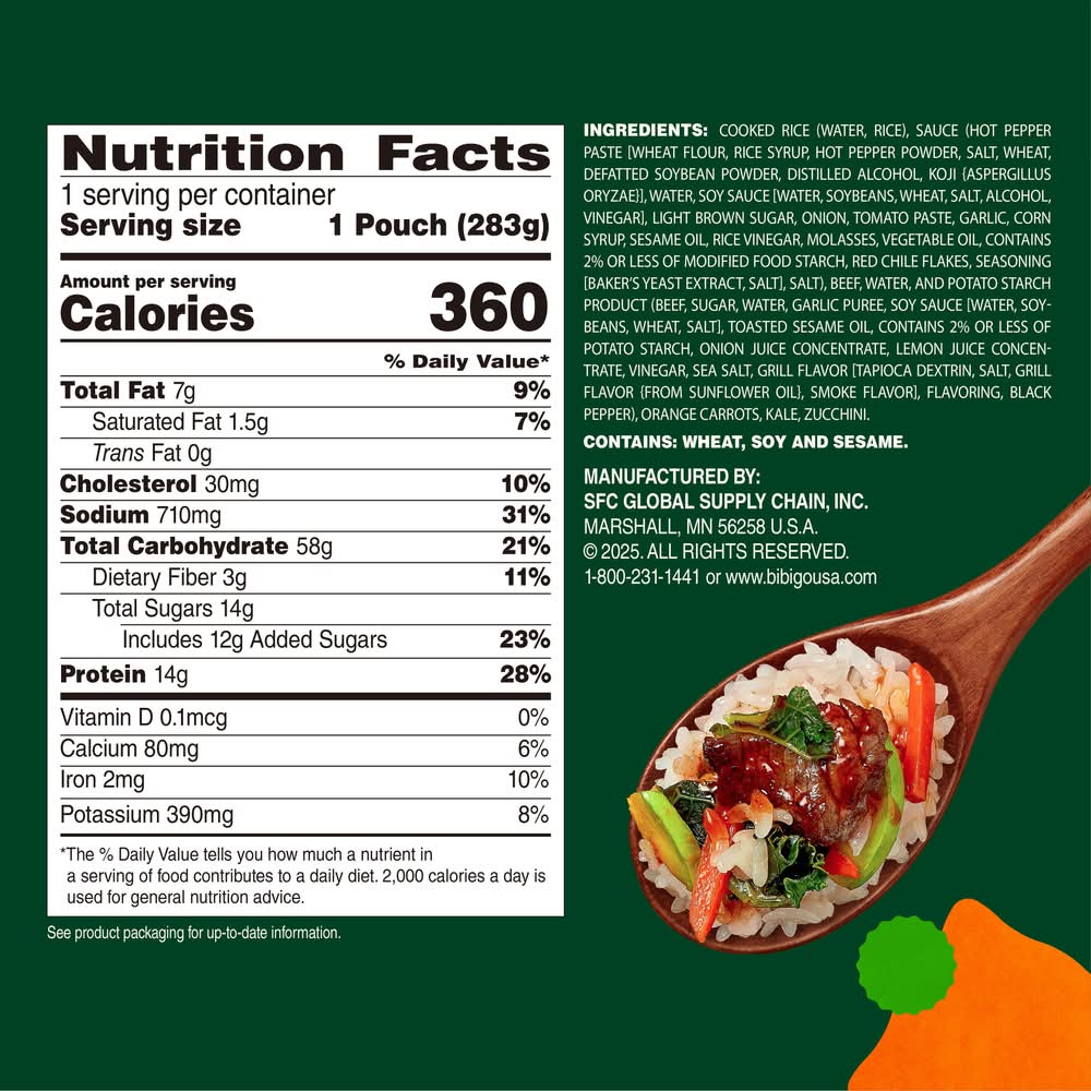 Ingredients: INGREDIENTS: COOKED RICE (WATER, RICE), SAUCE (HOT PEPPER PASTE [WHEAT FLOUR, RICE SYRUP, WATER, HOT PEPPER POWDER, SALT, WHEAT, DEFATTED SOYBEAN POWDER, DISTILLED ALCOHOL, WHEAT KOJI {ASPERGILLUS ORYZAE}], WATER, SOY SAUCE [WATER, SOYBEANS, WHEAT, SALT, ALCOHOL, VINEGAR], LIGHT BROWN SUGAR, ONION, TOMATO PASTE, GARLIC, CORN SYRUP, SESAME OIL, RICE VINEGAR, MOLASSES, VEGETABLE OIL, CONTAINS 2% OR LESS OF MODIFIED FOOD STARCH, RED CHILE FLAKES, SEASONING [YEAST EXTRACT, SALT], SALT), BEEF, WATER, AND POTATO STARCH PRODUCT (BEEF, SUGAR, WATER, GARLIC PUREE, SOY SAUCE [WATER, SOYBEANS, WHEAT, SALT], TOASTED SESAME OIL, CONTAINS 2% OR LESS OF POTATO STARCH, ONION JUICE CONCENTRATE, LEMON JUICE CONCENTRATE, VINEGAR, SEA SALT, GRILL FLAVOR [TAPIOCA DEXTRIN, SALT, GRILL FLAVOR {FROM SUNFLOWER OIL}, SMOKE FLAVOR], FLAVORING, BLACK PEPPER), ORANGE CARROTS, KALE, ZUCCHINI. Contains: Wheat, Soy, Sesame