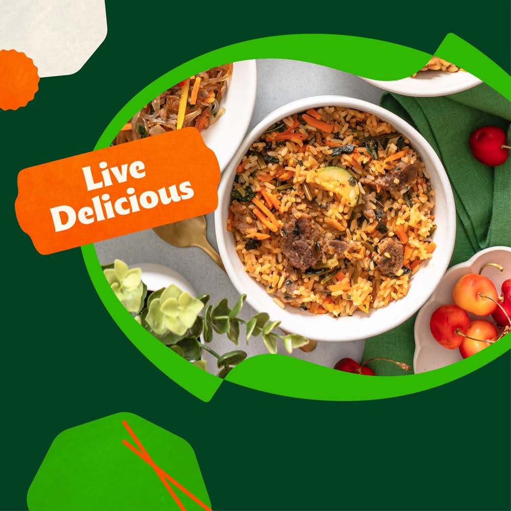 Grilled Beef, Carrots, Kale and Zucchini in a Spicy & Sweet Sauce Over a Bed of Rice Grilled beef bulgogi, vegetables, and gochujang sauce. Delicately layered in a bowl of rice. Stir for a delicious medley of Korean flavors. Bring delicious Korean flavors to your table! Number of servings: 1