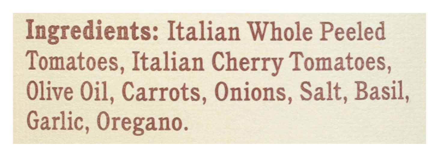 Ingredients: Italian Whole Peeled Tomatoes, Italian Cherry Tomatoes, Olive Oil, Carrots, Onions, Salt, Basil, Garlic, Oregano