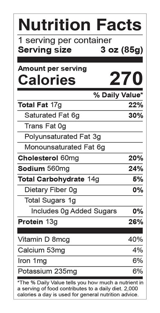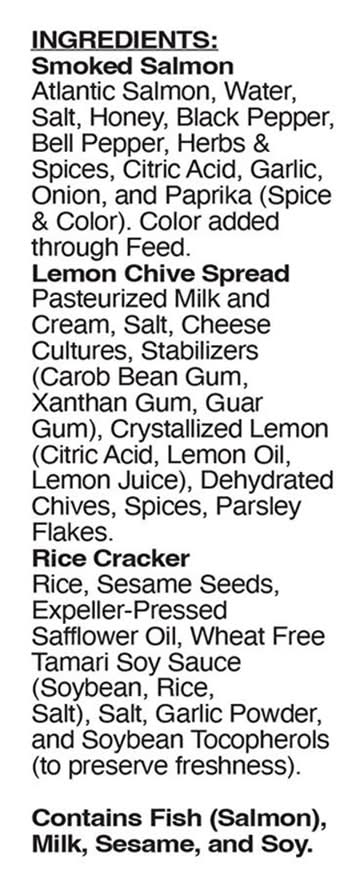 Ingredients: Smoked Salmon Atlantic Salmon, Water, Salt, Honey, Black Pepper, Bell Pepper, Herbs & Spices, Citric Acid, Garlic, Onion, and Paprika (Spice & Color), Color Added Through Feed, Lemon Chive Spread Pasteurized Milk and Cream, Salt, Cheese Cultures, Stabilizers (Carob Bean Gum, Xanthan Gum, Guar Gum), Crystallized Lemon (Citric Acid, Lemon Oil, Lemon Juice), Dehydrated Chives, Spices, Parsley Flakes, Rice Cracker Rice, Sesame Seeds, Expeller-Pressed Safflower Oil, Wheat Free Tamari Soy Sauce (Soybean, Rice, Salt), Salt, Garlic Powder, and Soybean Tocopherols (to Preserve Freshness) Contains: Fish, Salmon, Milk, Sesame, Soybeans