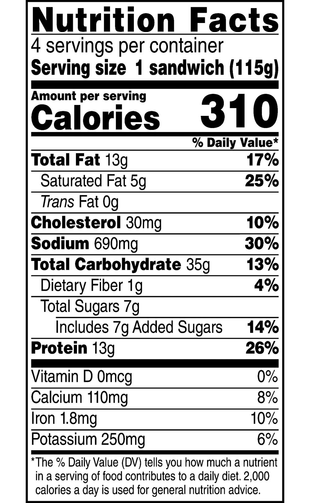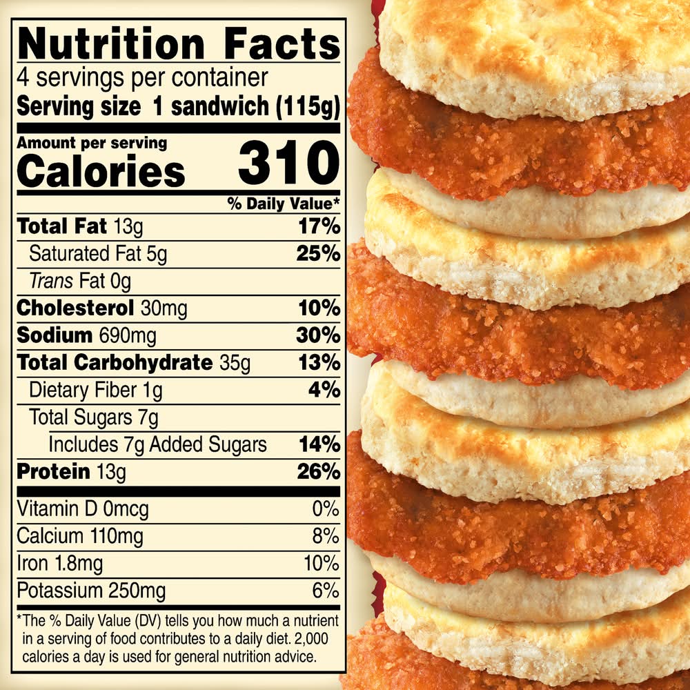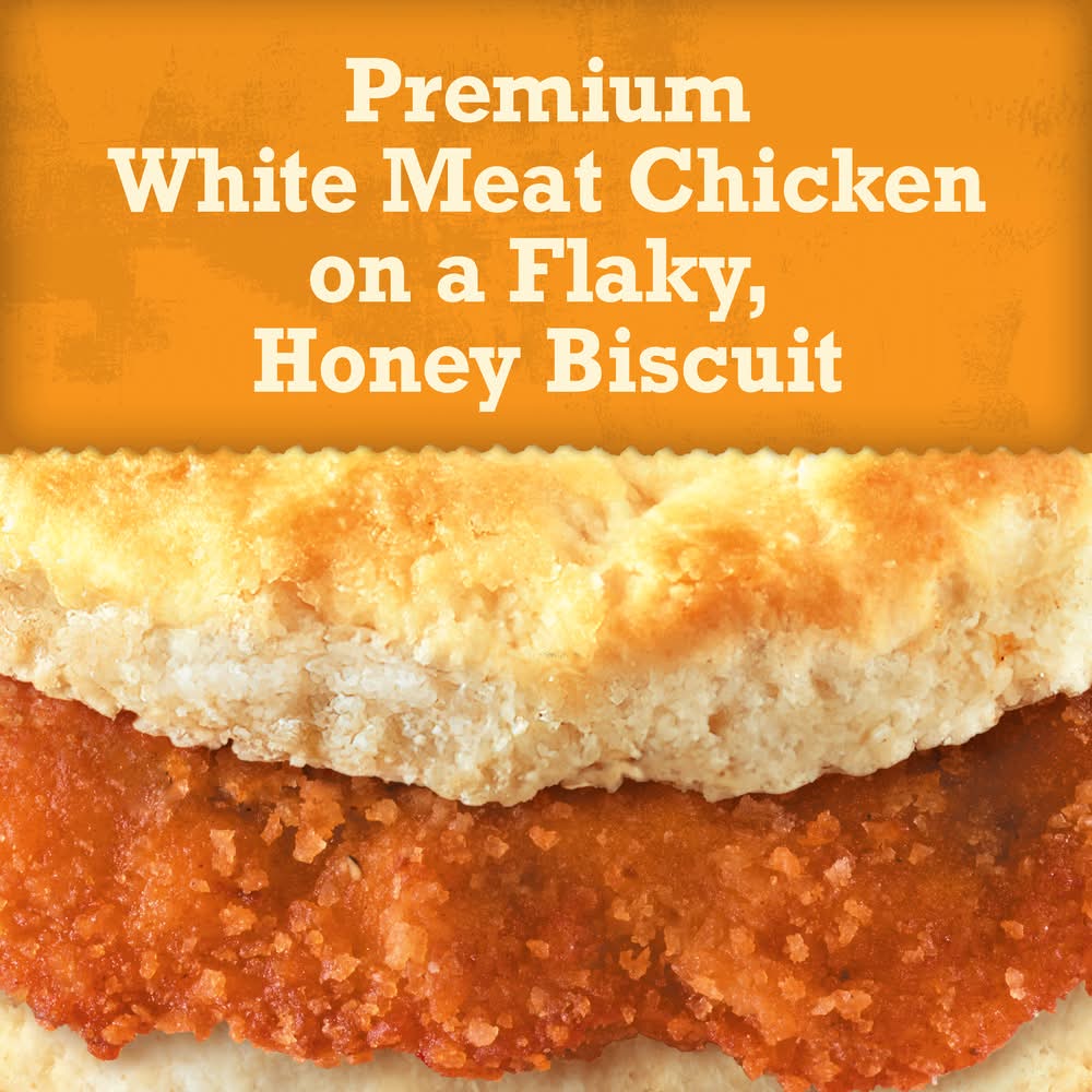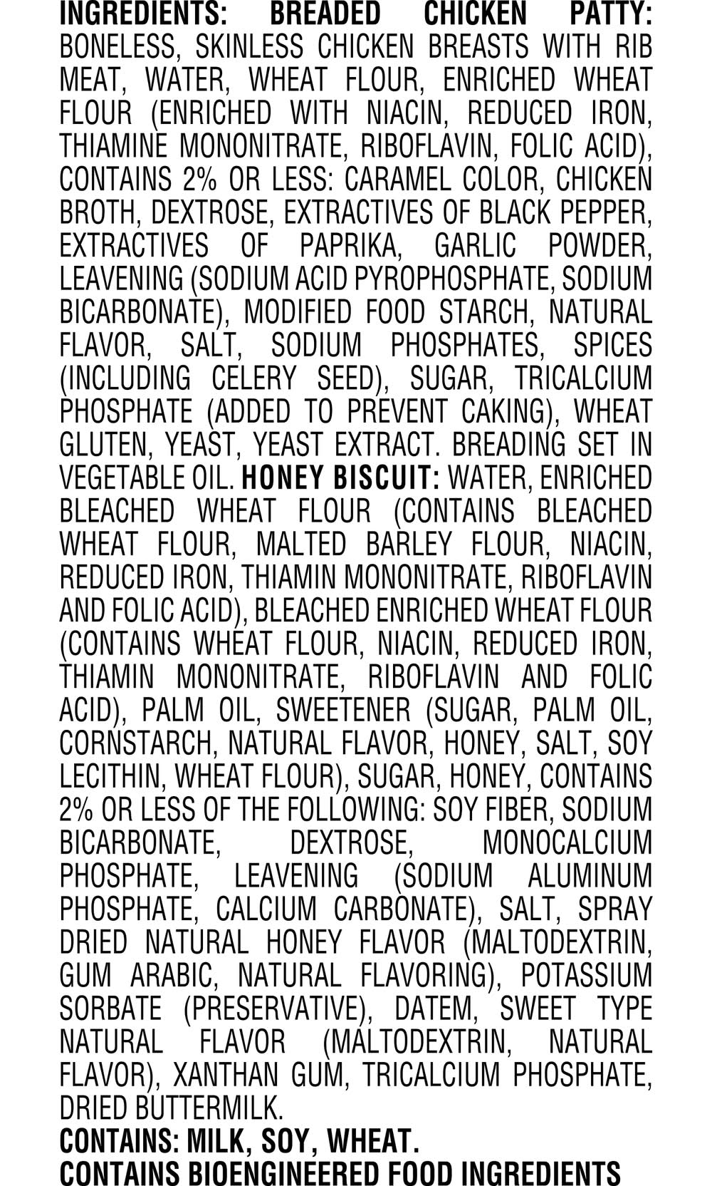 Ingredients: BREADED CHICKEN PATTY: Boneless, Skinless Chicken Breasts With Rib Meat, Water, Wheat Flour, Enriched Wheat Flour (Enriched With Niacin, Reduced Iron, Thiamine Mononitrate, Riboflavin, Folic Acid), Contains 2% Or Less: Caramel Color, Chicken Broth, Dextrose, Extractives Of Black Pepper, Extractives Of Paprika, Garlic Powder, Leavening (Sodium Acid Pyrophosphate, Sodium Bicarbonate), Modified Food Starch, Natural Flavor, Salt, Sodium Phosphates, Spices (Including Celery Seed), Sugar, Tricalcium Phosphate (Added To Prevent Caking), Wheat Gluten, Yeast, Yeast Extract. Breading Set In Vegetable Oil. HONEY BISCUIT: Water, Enriched Bleached Wheat Flour (Contains Bleached Wheat Flour, Malted Barley Flour, Niacin, Reduced Iron, Thiamin Mononitrate, Riboflavin And Folic Acid), Bleached Enriched Wheat Flour (Contains Wheat Flour, Niacin, Reduced Iron, Thiamin Mononitrate, Riboflavin And Folic Acid), Palm Oil, Sweetener (Sugar, Palm Oil, Cornstarch, Natural Flavor, Honey, Salt, Soy Lecithin, Wheat Flour), Sugar, Honey, Contains 2% Or Less Of The Following: Soy Fiber, Sodium Bicarbonate, Dextrose, Monocalcium Phosphate, Leavening (Sodium Aluminum Phosphate, Calcium Carbonate), Salt, Spray Dried Natural Honey Flavor (Maltodextrin, Gum Arabic, Natural Flavoring), Potassium Sorbate (Preservative), DATEM, Sweet Type Natural Flavor (Maltodextrin, Natural Flavor), Xanthan Gum, Tricalcium Phosphate, Dried Buttermilk. Contains: Dairy, Gluten, Lactose, Milk, Soy, Wheat Additives: Genetically Modified Ingredients