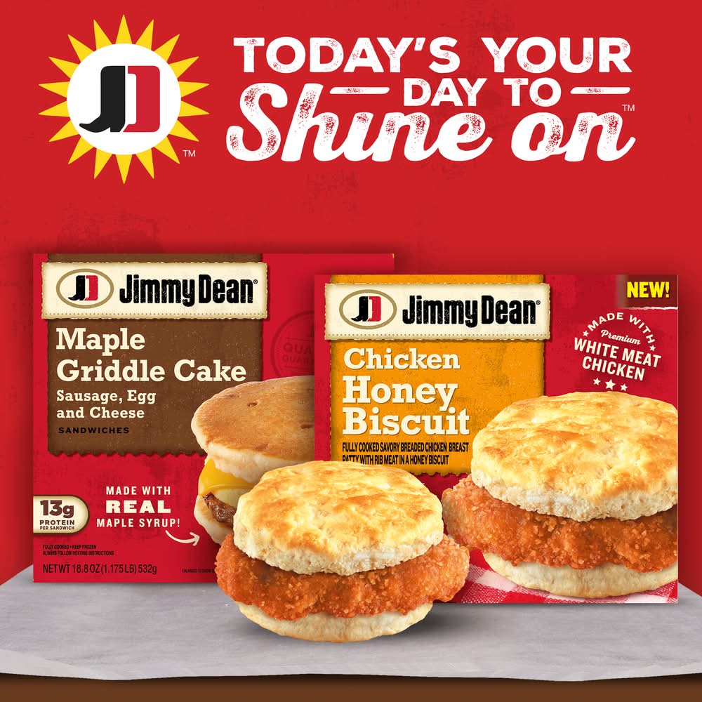 Enjoy a classic and easy breakfast that starts the day off right with our Jimmy Dean Chicken Honey Biscuits. Taste the crisp white meat chicken in the patties sandwiched by flaky and soft honey biscuits. Each chicken and biscuit breakfast sandwich has 13 grams of protein and is made with premium white meat chicken and real honey. Easily prepare in the microwave or the air fryer for an extra crisp texture, and follow the cooking directions on the box. Each box contains four sandwiches. Keep frozen until ready to prepare. Ready when you are, our Jimmy Dean Chicken Honey Biscuits help your day in a sweet and savory way. Flavor: Chicken