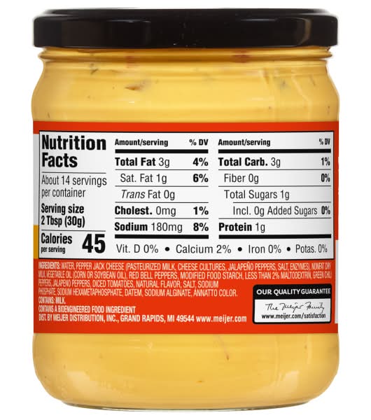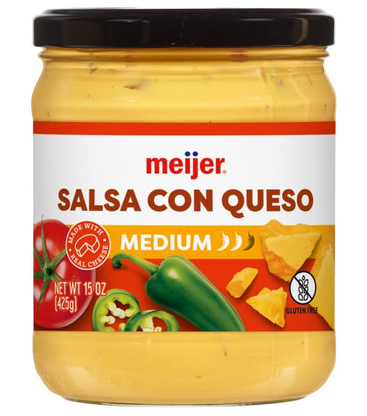Meijer Salsa Con Queso blends jalapenos and green chili peppers to deliver a medium-spiced flavor profile, ideal for enhancing various dishes. It serves as a perfect accompaniment for dipping tortilla chips or as a flavorful addition to casseroles. This product is crafted to introduce a subtle heat to each bite, enhancing the overall taste experience.