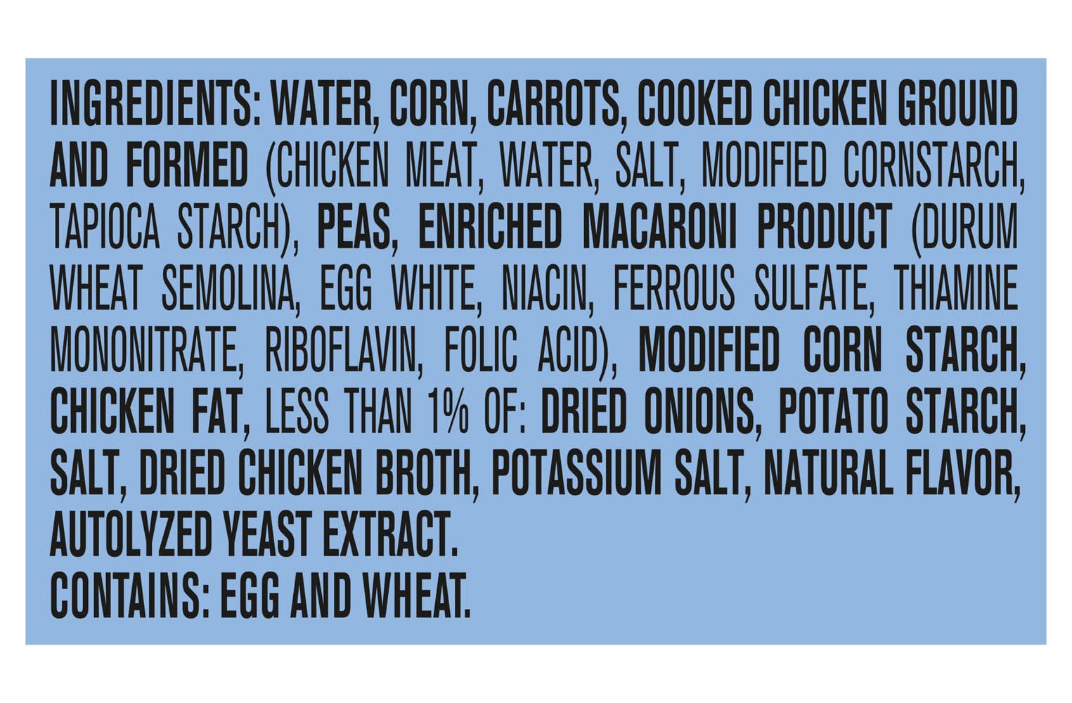 Ingredients: Water, Corn, Carrots, Cooked Chicken Ground and Formed (Chicken Meat, Water, Salt, Modified Cornstarch, Tapioca Starch), Peas, Enriched Macaroni Product (Durum Wheat Semolina, Egg White, Niacin, Ferrous Sulfate, Thiamine Mononitrate, Riboflavin, Folic Acid), Modified Corn Starch, Chicken Fat, Less than 1% of: Dried Onions, Potato Starch, Salt, Dried Chicken Broth, Potassium Salt, Natural Flavor, Autolyzed Yeast Extract Contains: Eggs, Wheat