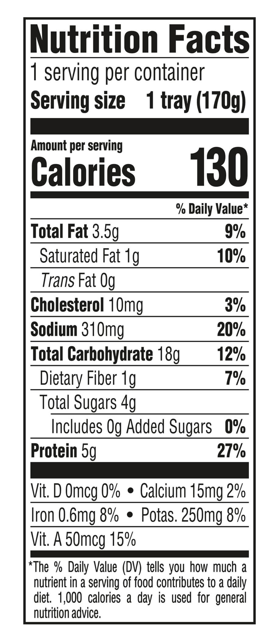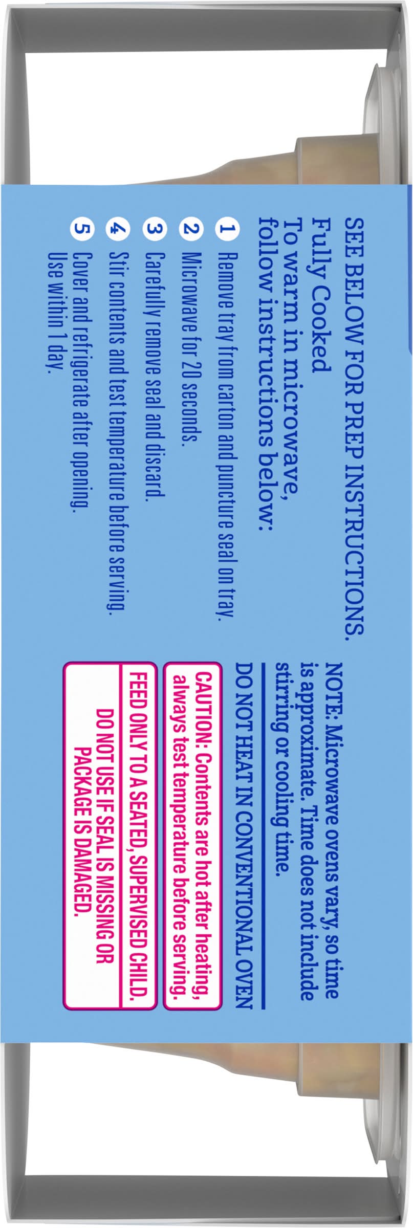Preparation instructions: (1) remove tray from carton sleeve. (2) puncture seal on tray and microwave on high (100% power) for 20 seconds. (3) carefully remove seal and discard. (4) stir contents and test temperature before saving. (5) cover and refrigerate after opening. discard after 24 hours. note: microwave ovens vary, so time is approximate. do not heat in conventional oven.