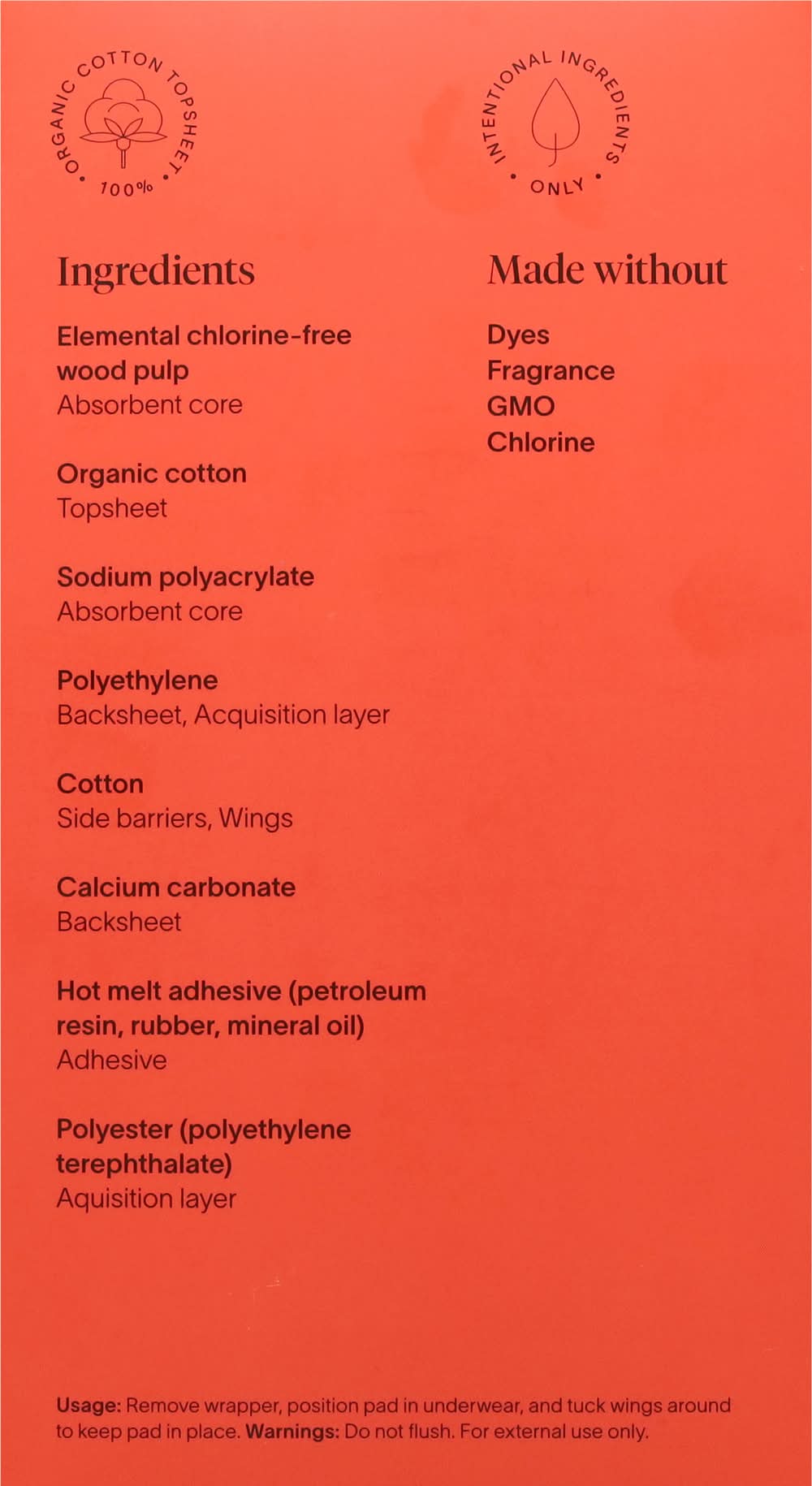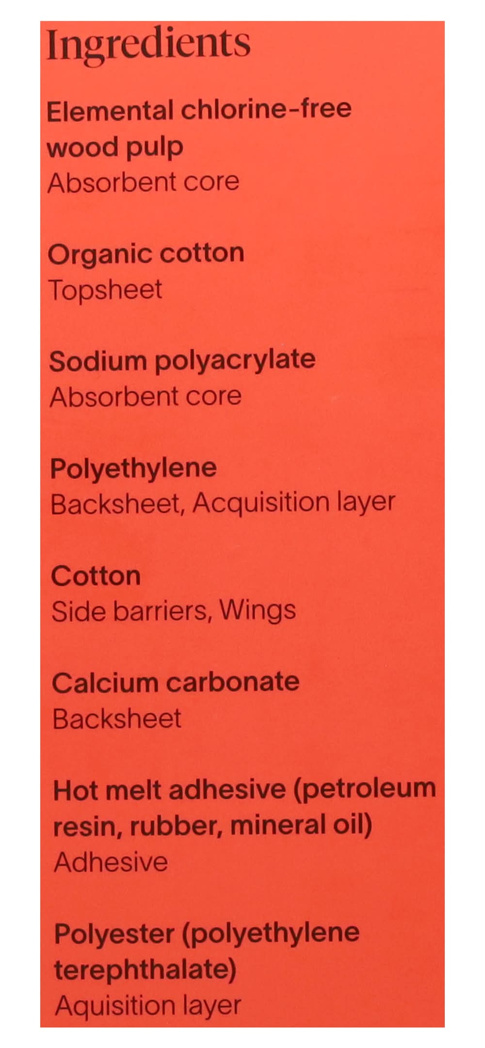 Ingredients: Elemental Chlorine-Free Wood Pulp, Organic Cotton, Sodium Polyacrylate, Polyethylene, Cotton, Calcium Carbonate, Hot Melt Adhesive (Petroleum Resin, Rubber, Mineral Oil), Polyester (Polyethylene Terephthalate)